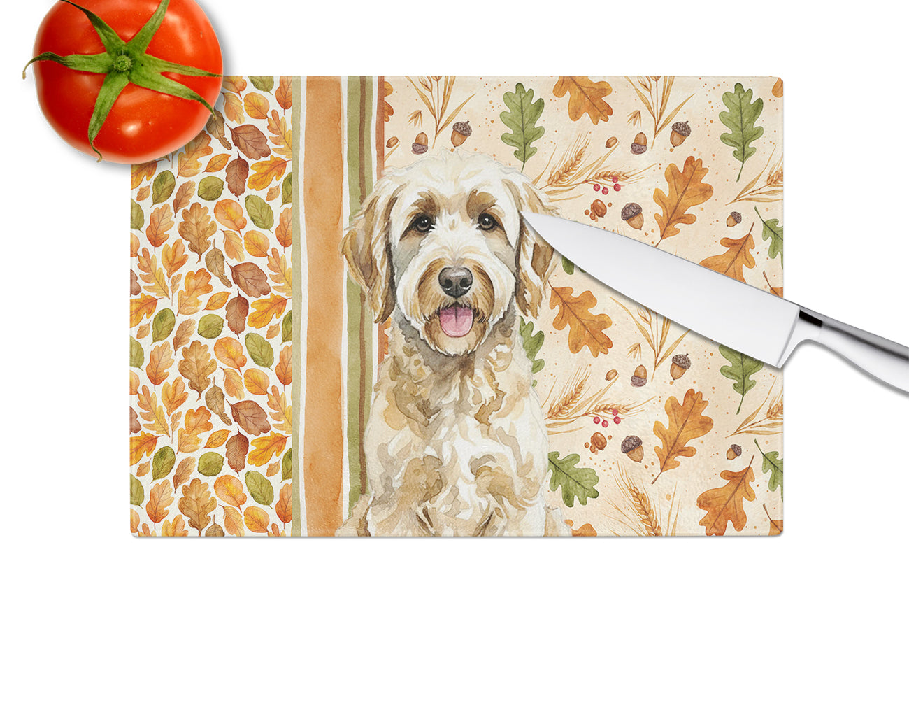 Glass Cutting Board featuring breed specific Labradoodle artwork. Celebrate Thanksgiving with this Thanksgiving Cutting Board. Introduce your kitchen to the vibrant, large Decorative Glass Cutting Board from Caroline's Treasures. Crafted from resilient tempered glass, this board is not only a utilitarian necessity but also a colorful art piece. With its generous dimensions of 15 inches in height and 12 inches in length, it offers ample space for all your cutting needs. Every piece showcases captivating artwork from distinguished artists, bringing an aesthetic edge to your kitchen. Beyond its attractive design, this cutting board ensures your countertop stays pristine and unscathed, owing to its heat-resistant properties. Engineered with user convenience in mind, it features non-skid feet for stability, and rounded corners for additional safety. Its robust construction renders it virtually unbreakable, guaranteeing longevity. The board comes with protective feet bumpers, maintaining its position during use. This product is recommended to be hand washed only. Proudly printed and assembled in the United States, this cutting board exemplifies superior craftsmanship. With Caroline's Treasures' Decorative Glass Cutting Board, you're investing in a blend of functionality and artistic flair.