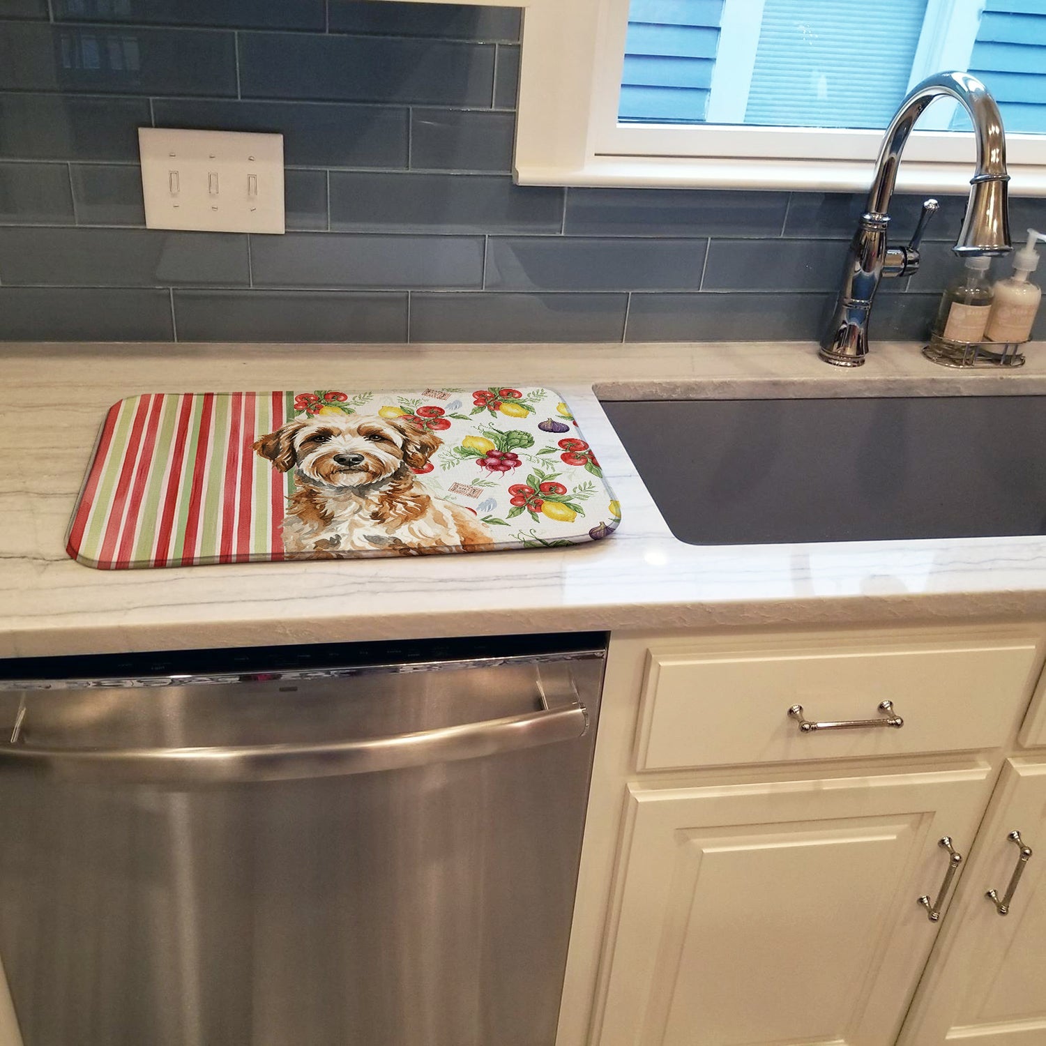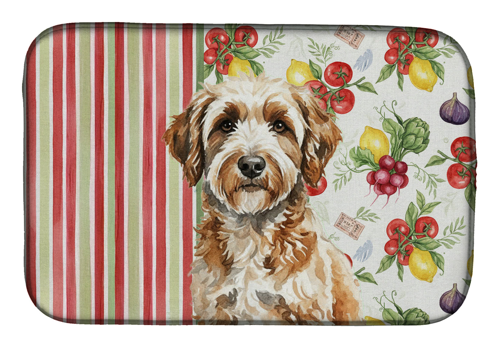 Shown here is the Lagotto Romagnolo Vegetables Dish Drying Mat from Caroline's Treasures featuring artwork of a Lagotto Romagnolo in a Everyday design. The detailed illustration and vibrant colors make it a standout accent that celebrates both seasonal style and love for the subject. This image features a vibrant watercolor vegetable pattern with tomatoes, lemons, artichokes, figs, radishes, and leafy greens arranged in a repeating design, paired with classic red and green stripes. The bright, garden-fresh palette creates a cheerful, farmhouse-inspired look that feels lively, welcoming, and perfect for kitchen décor. Everyday décor celebrates personal style and the small moments that make a house feel like home. Thoughtful designs add warmth and personality that can be enjoyed year-round. Say goodbye to messy countertops and soggy dish towels with our innovative dish drying mat. Our high-quality dish drying pad is designed to keep your countertops dry while offering a stylish and efficient solution. Whether you're air drying dishes, glasses, stemware, silverware, pots, pans, bottles, or even fruits and vegetables, our dish mat is the perfect choice. The 14 inches x 21 inches size fits most counters and dish drying racks, and the non-slip design ensures stability. Made with water-absorbent polyester and a polyurethane foam insert, our dish drying mat is not only functional but also durable. It's machine washable and printed in the USA for long-lasting use. The beautiful artwork adds flair to your kitchen decor, making it a perfect housewarming gift or present for any occasion. Upgrade your kitchen experience with our absorbent and versatile dish drying mat. Perfect for: Kitchen counters and sinks, everyday dish drying and countertop protection, Dogs-themed homes, or year-round use for Lagotto Romagnolo lovers. Lagotto Romagnolos are intelligent working dogs known for their curly coats and strong scenting ability. This Italian breed is admired for its loyalty, trainability, and energetic personality. Makes a heartfelt gift for: Lagotto Romagnolo owners, Dogs lovers, Everyday gifts, pet parents, friends who adore their Lagotto Romagnolo, or anyone celebrating Dogs.