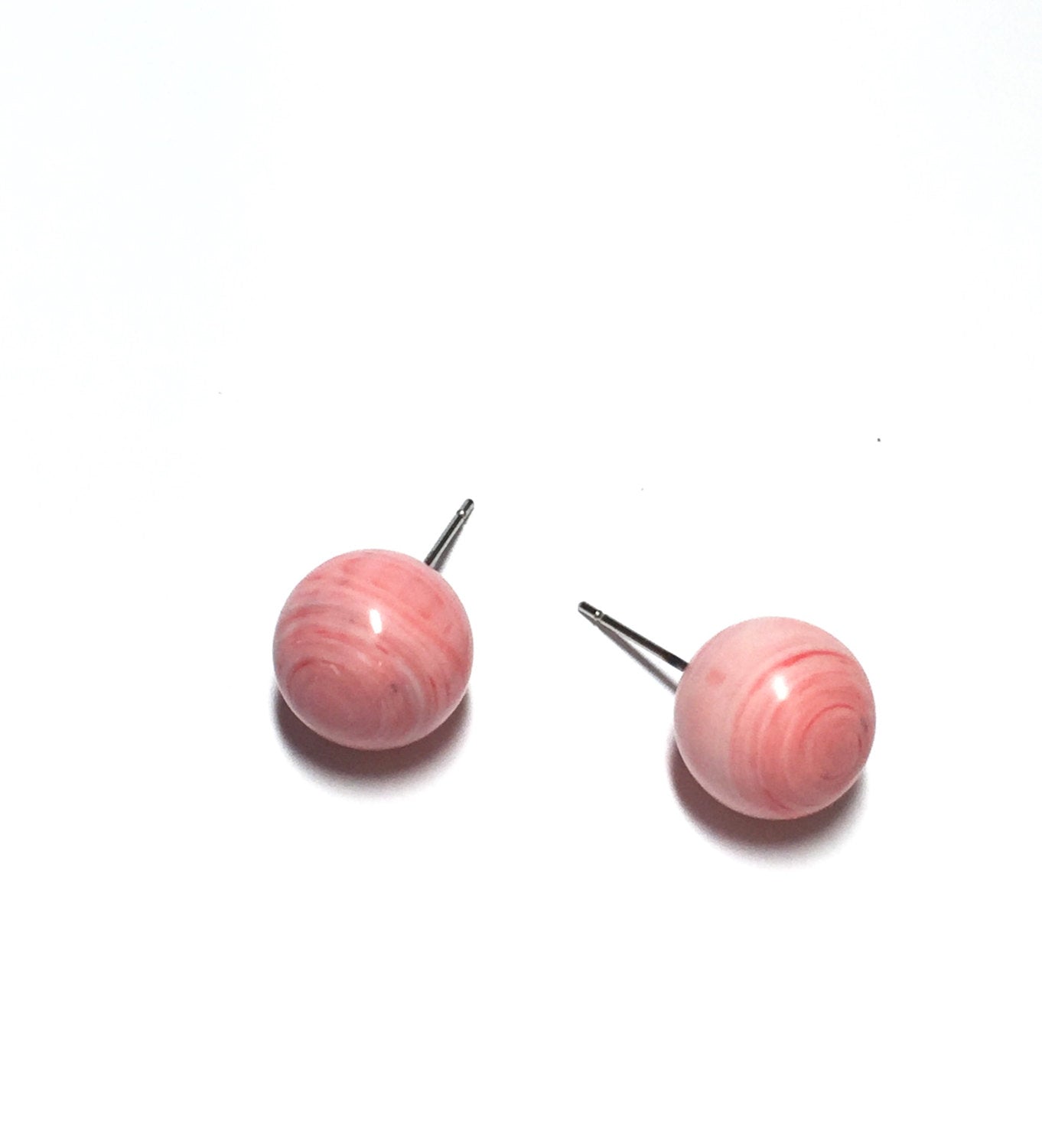 Light pink stud earrings in a great marbled shiny finish. These earrings measure approximately 12mm or just under 1/2" in diameter - just big enough to be classic & go with everything, but they'll get noticed. Check out the last pic for an idea of the size & scale of this style.