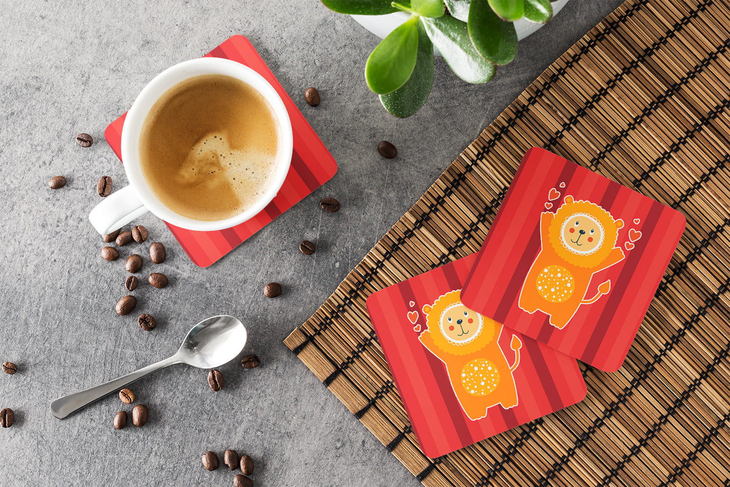Decorate your space with our Valentine's Day Lion artwork on a Coaster set. Presenting our Set of 4 Foam Coasters, a stylish and practical addition to your table setting. Each square coaster, measuring 3 1/2 inches by 3 1/2 inches, is perfectly sized to accommodate various drinkware, from coffee mugs to tumblers. These coasters stand out with their full-color artwork, permanently dyed onto the material for a vibrant and fade-resistant finish. They're not just functional, they're a fashionable statement, adding a touch of flair to any gathering or event. Our foam coasters serve a dual purpose - they protect your table from water stains and are perfect for both hot and cold drinks. The material used is similar to that of our high-quality mouse pads, ensuring durability and heat resistance. These coasters are easy to maintain - simply wash them in the top of your dishwasher and lay flat to dry. The design won't come off, ensuring they retain their vivid colors for years. Pair them with one of our insulated coolers or huggers for a cohesive, thoughtful gift set. Enhance your beverage experience with our Set of 4 Foam Coasters.