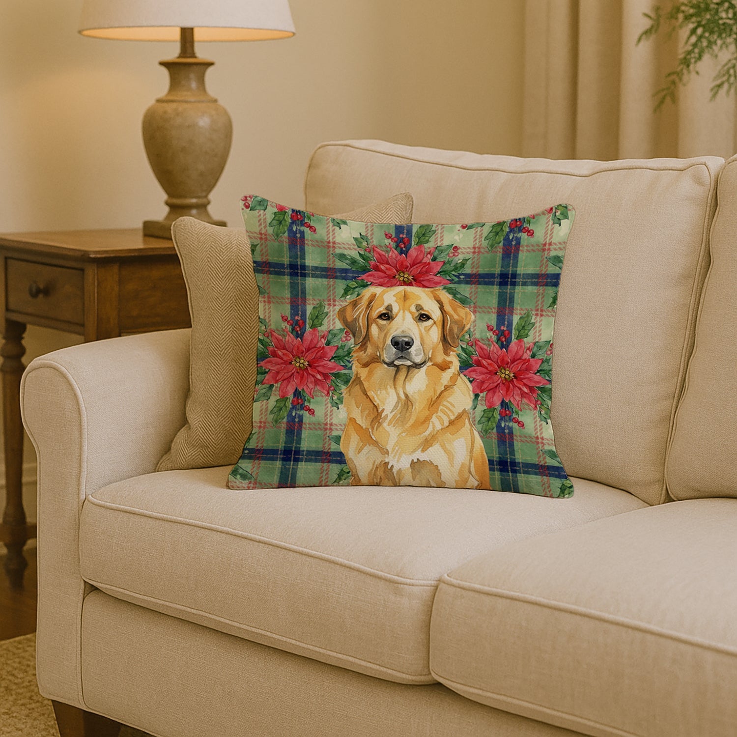 Throw Pillow featuring breed specific Leonberger artwork. Celebrate Christmas with this Christmas Pillow. Add a touch of vibrancy and comfort to your outdoor seating with Caroline's Treasures Fabric Decorative Pillow. Measuring approximately 14 inches by 14 inches, this outdoor pillow is crafted to elevate the appeal of your patio furniture, infusing it with vivid color and artistic flair. The pillow includes a 100% Polyester Fabric sham filled with a quality pillow form to provide superior comfort. Innovatively made from our brand new material, specifically woven for its water resistance, this pillow is designed for durability. The soft canvas fabric offers versatility in use, fit for your indoor couch or your outdoor patio, porch, or veranda. The fabric is dyed with colorfast dyes built for resilience against weather conditions, ensuring the pillow retains its beauty over time. Constructed by sewing three fabric pieces to create a sham, the polyester insert is then nestled inside to form the pillow, resulting in an overstuffed pillow that maintains its shape. Both the sham and the pillow insert are proudly made in the United States. As the pillows are handcrafted, there may be minor variations in size, further enhancing their unique charm. Experience comfort in style with Caroline's Treasures Fabric Decorative Pillow.