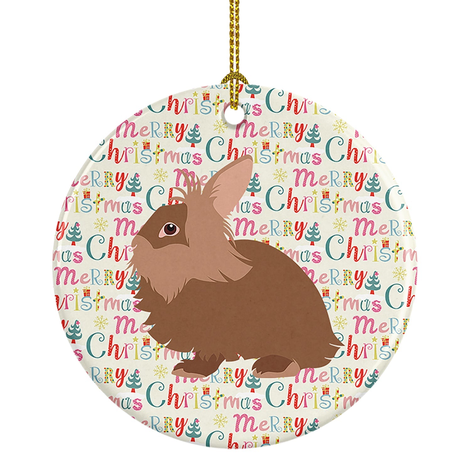 Decorate your space with our Christmas Lionhead Rabbit artwork on a Ornament. Add a touch of personalized charm to your Christmas tree this holiday season with our Ceramic Ornament. Measuring 2.8125 inches in diameter, this round porcelain ornament beautifully reflects your festive lights, enhancing your holiday decor. The gloss surface sets off the vibrant, full-color artwork contributed by one of our talented artists, bringing a pop of color and joy to your tree. This Ceramic Ornament doesn't stop at being merely decorative. The white back is designed for personalization. Write a heartfelt message, mark a special year, or inscribe a date with a paint pen or a permanent marker to create a treasured memento. Please ensure you allow any personalization to dry thoroughly before handling to maintain the pristine finish. Included with the ornament is a delicate gold cord for easy hanging. Made in the USA, this Ceramic Ornament makes an exceptional gift for a pet sitter, teacher, family member, or anyone you wish to share a little Christmas magic with. With its blend of style, charm, and personal touch, it's a meaningful addition to any Christmas tree.
