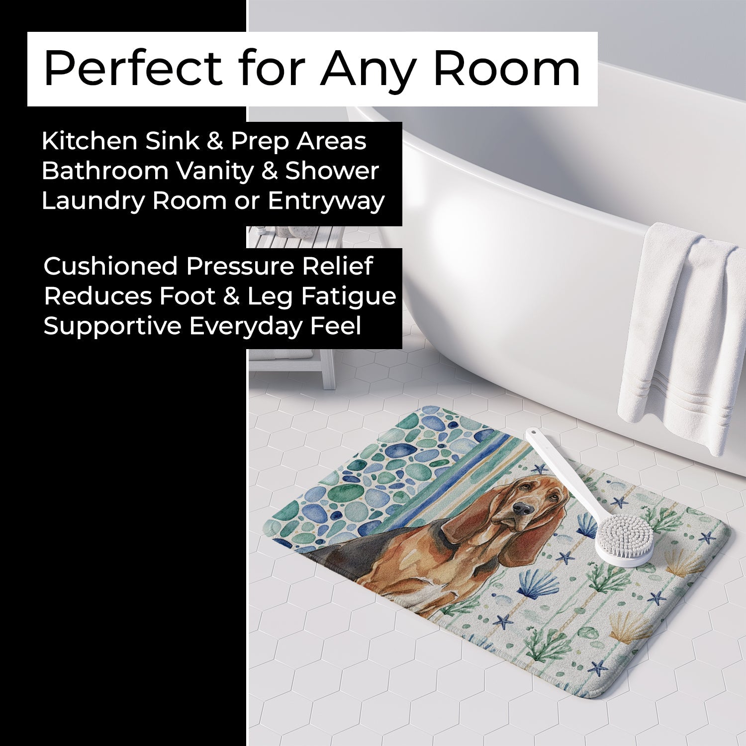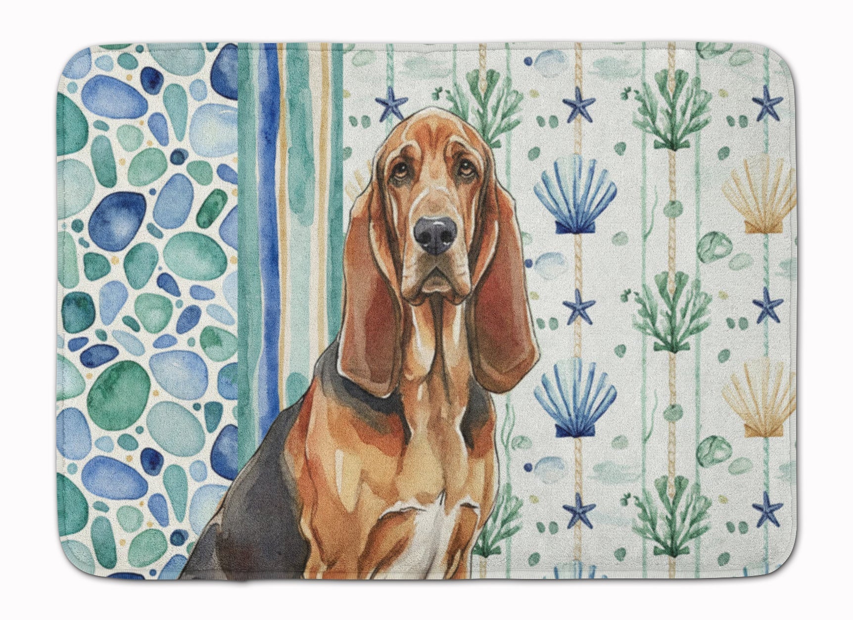 Shown here is the Liver and Tan Bloodhound Coastal Sea Glass Memory Foam Kitchen Mat from Caroline's Treasures featuring artwork of a Bloodhound in a Everyday design. The detailed illustration and vibrant colors make it a standout accent that celebrates both seasonal style and love for the subject. This image features a calming coastal watercolor pattern with soft seashells, seaweed, starfish, and pebble-inspired accents arranged in a repeating design. The soothing palette of blues, greens, and sandy neutrals creates a relaxed, beach-inspired look that adds a fresh and tranquil feel to any space. Everyday décor celebrates personal style and the small moments that make a house feel like home. Thoughtful designs add warmth and personality that can be enjoyed year-round. Transform your floor into a work of art with Caroline's Treasures' Memory Foam Mat. This mat offers not only a stunning visual appeal but also a luxurious, plush feel that's incredibly comfortable to the touch. It's a versatile, machine-washable mat designed for both bath and kitchen use, ensuring you experience the best in comfort and convenience. Care Instructions: Maintaining this memory foam mat is a breeze. Simply follow the care instructions on the product tag. It's recommended to wash in cold water and dry on a low-temperature setting in the dryer. This ensures the mat retains its quality and longevity, allowing you to enjoy its beauty and comfort for a long time. Caroline's Treasures' Memory Foam Mat Machine Washable is the perfect blend of artistry, comfort, and practicality, making it a standout addition to any space. Upgrade your home decor with this versatile and stylish mat today. Bloodhounds are scent hounds renowned for their exceptional tracking ability and gentle personality. This breed is admired for its determination, loyalty, and calm demeanor. Makes a heartfelt gift for: Bloodhound owners, Dogs lovers, Everyday gifts, pet parents, friends who adore their Bloodhound, or anyone celebrating Dogs.
