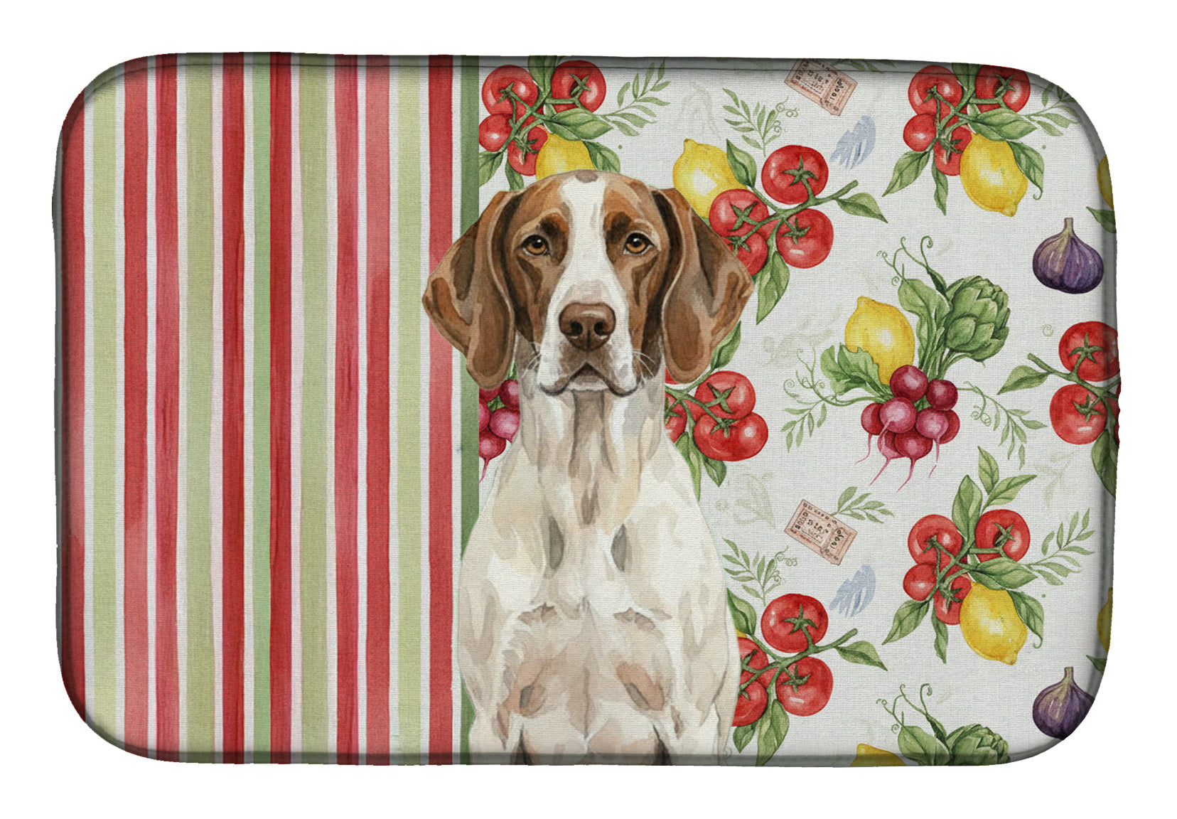 Shown here is the Liver and White Pointer Vegetables Dish Drying Mat from Caroline's Treasures featuring artwork of a Pointer in a Everyday design. The detailed illustration and vibrant colors make it a standout accent that celebrates both seasonal style and love for the subject. This image features a vibrant watercolor vegetable pattern with tomatoes, lemons, artichokes, figs, radishes, and leafy greens arranged in a repeating design, paired with classic red and green stripes. The bright, garden-fresh palette creates a cheerful, farmhouse-inspired look that feels lively, welcoming, and perfect for kitchen décor. Everyday décor celebrates personal style and the small moments that make a house feel like home. Thoughtful designs add warmth and personality that can be enjoyed year-round. Say goodbye to messy countertops and soggy dish towels with our innovative dish drying mat. Our high-quality dish drying pad is designed to keep your countertops dry while offering a stylish and efficient solution. Whether you're air drying dishes, glasses, stemware, silverware, pots, pans, bottles, or even fruits and vegetables, our dish mat is the perfect choice. The 14 inches x 21 inches size fits most counters and dish drying racks, and the non-slip design ensures stability. Made with water-absorbent polyester and a polyurethane foam insert, our dish drying mat is not only functional but also durable. It's machine washable and printed in the USA for long-lasting use. The beautiful artwork adds flair to your kitchen decor, making it a perfect housewarming gift or present for any occasion. Upgrade your kitchen experience with our absorbent and versatile dish drying mat. Perfect for: Kitchen counters and sinks, everyday dish drying and countertop protection, Dogs-themed homes, or year-round use for Pointer lovers. Pointers are athletic sporting dogs known for their focus and endurance. This hunting breed is admired for its intelligence, loyalty, and strong work drive. Makes a heartfelt gift for: Pointer owners, Dogs lovers, Everyday gifts, pet parents, friends who adore their Pointer, or anyone celebrating Dogs.