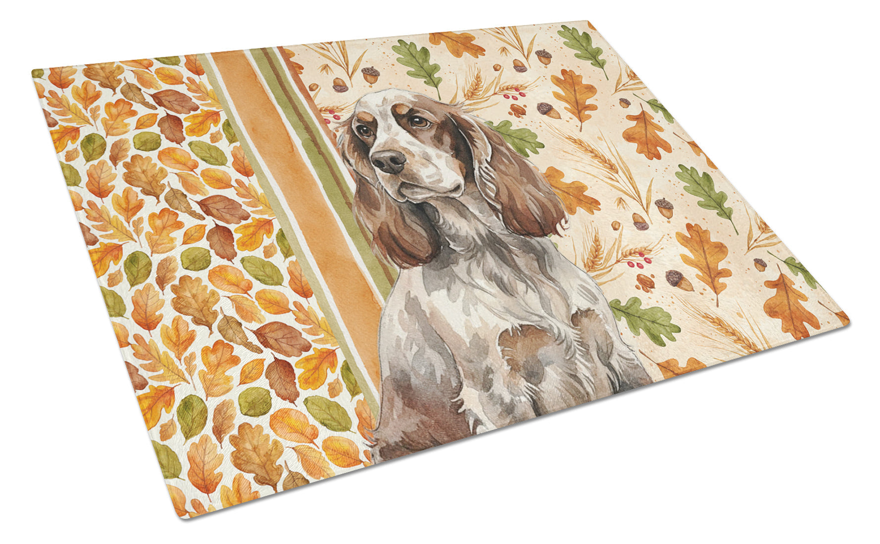 Glass Cutting Board featuring breed specific English Cocker Spaniel artwork. Celebrate Thanksgiving with this Thanksgiving Cutting Board. Introduce your kitchen to the vibrant, large Decorative Glass Cutting Board from Caroline's Treasures. Crafted from resilient tempered glass, this board is not only a utilitarian necessity but also a colorful art piece. With its generous dimensions of 15 inches in height and 12 inches in length, it offers ample space for all your cutting needs. Every piece showcases captivating artwork from distinguished artists, bringing an aesthetic edge to your kitchen. Beyond its attractive design, this cutting board ensures your countertop stays pristine and unscathed, owing to its heat-resistant properties. Engineered with user convenience in mind, it features non-skid feet for stability, and rounded corners for additional safety. Its robust construction renders it virtually unbreakable, guaranteeing longevity. The board comes with protective feet bumpers, maintaining its position during use. This product is recommended to be hand washed only. Proudly printed and assembled in the United States, this cutting board exemplifies superior craftsmanship. With Caroline's Treasures' Decorative Glass Cutting Board, you're investing in a blend of functionality and artistic flair.