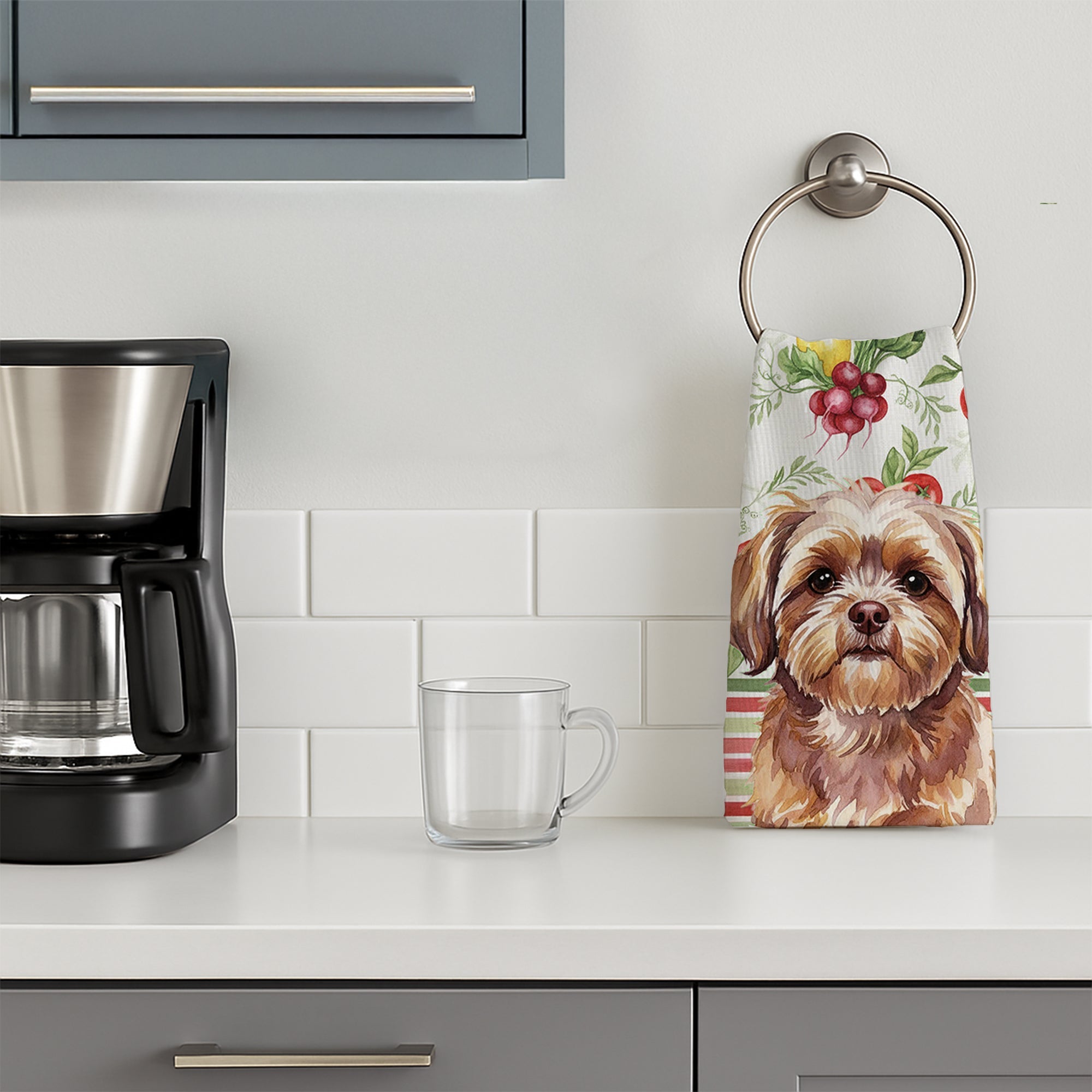 Shown here is the Liver Shih Tzu Vegetables Kitchen Towel from Caroline's Treasures featuring artwork of a Shih Tzu in a Everyday design. The detailed illustration and vibrant colors make it a standout accent that celebrates both seasonal style and love for the subject. This image features a vibrant watercolor vegetable pattern with tomatoes, lemons, artichokes, figs, radishes, and leafy greens arranged in a repeating design, paired with classic red and green stripes. The bright, garden-fresh palette creates a cheerful, farmhouse-inspired look that feels lively, welcoming, and perfect for kitchen décor. Everyday décor celebrates personal style and the small moments that make a house feel like home. Thoughtful designs add warmth and personality that can be enjoyed year-round. Bring cozy everyday charm to your sink or powder room with a plush velour towel featuring original watercolor artwork. The front is a soft, color-rich minky polyester that polishes glassware to a brilliant shine; the back is 100% white cotton terry loop for quick absorbency on hands, dishes, and counters. Artwork is dyed into the fibers for lasting color that won’t crack or peel. Finished edges keep the shape wash after wash. Size: 15" x 25". Machine wash; tumble dry low. Designed and printed in the USA. Perfect for: Kitchen counters, ovens, and towel bars, everyday drying and cleanup, -themed kitchens, or year-round use for Shih Tzu lovers. Shih Tzus are affectionate companion dogs known for their friendly temperament and flowing coats. This ancient breed is cherished for its loyalty, gentle nature, and close bond with family. Makes a heartfelt gift for: Shih Tzu owners, lovers, Everyday gifts, pet parents, friends who adore their Shih Tzu, or anyone celebrating .