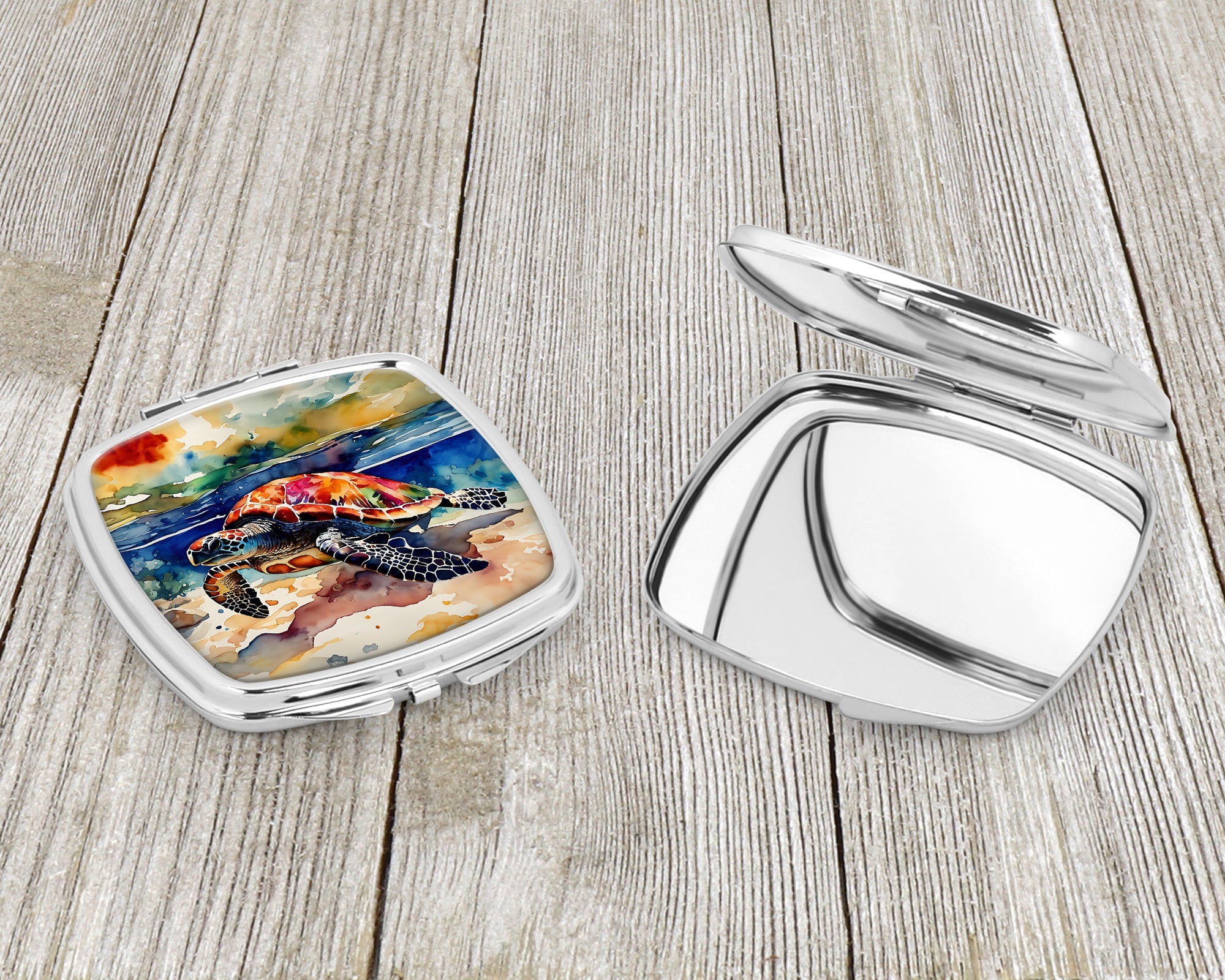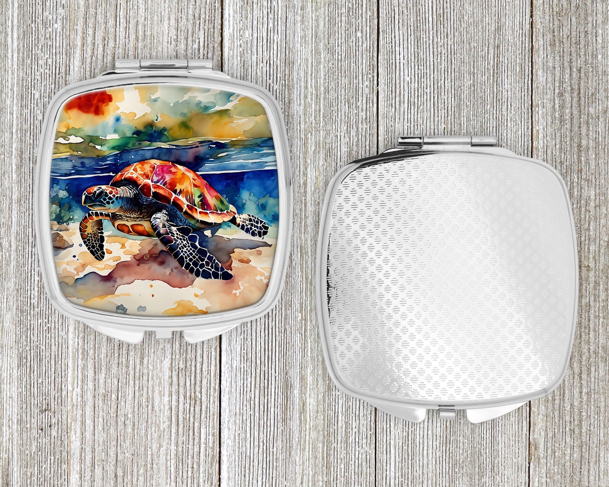 Decorate your space with our Loggerhead Sea Turtle artwork on a Compact Mirror. Introducing our Square Compact Mirror, a blend of elegance, functionality, and compactness, perfect for on-the-go touch-ups. This Silvertone metal mirror, with dimensions of 2.75 inches x 3 inches x .3 inches, fits effortlessly into your purse, handbag, or pocket, ensuring that you can check your appearance anytime, anywhere. Our compact mirror stands out with its eye-catching artwork on the front, adding a dash of style to this practical accessory. It is more than just a mirror; it's a statement piece that reflects your personality and aesthetic. When opened, this compact reveals two mirrors inside, doubling your perspective for precise touch-ups. The Silvertone metal construction ensures durability while maintaining a lightweight feel, making it an ideal everyday carry item. Whether you're rushing to a meeting, prepping for a dinner date, or just need a quick check on your look, our Square Compact Mirror is your reliable companion. Experience the perfect blend of style and practicality with this must-have accessory.