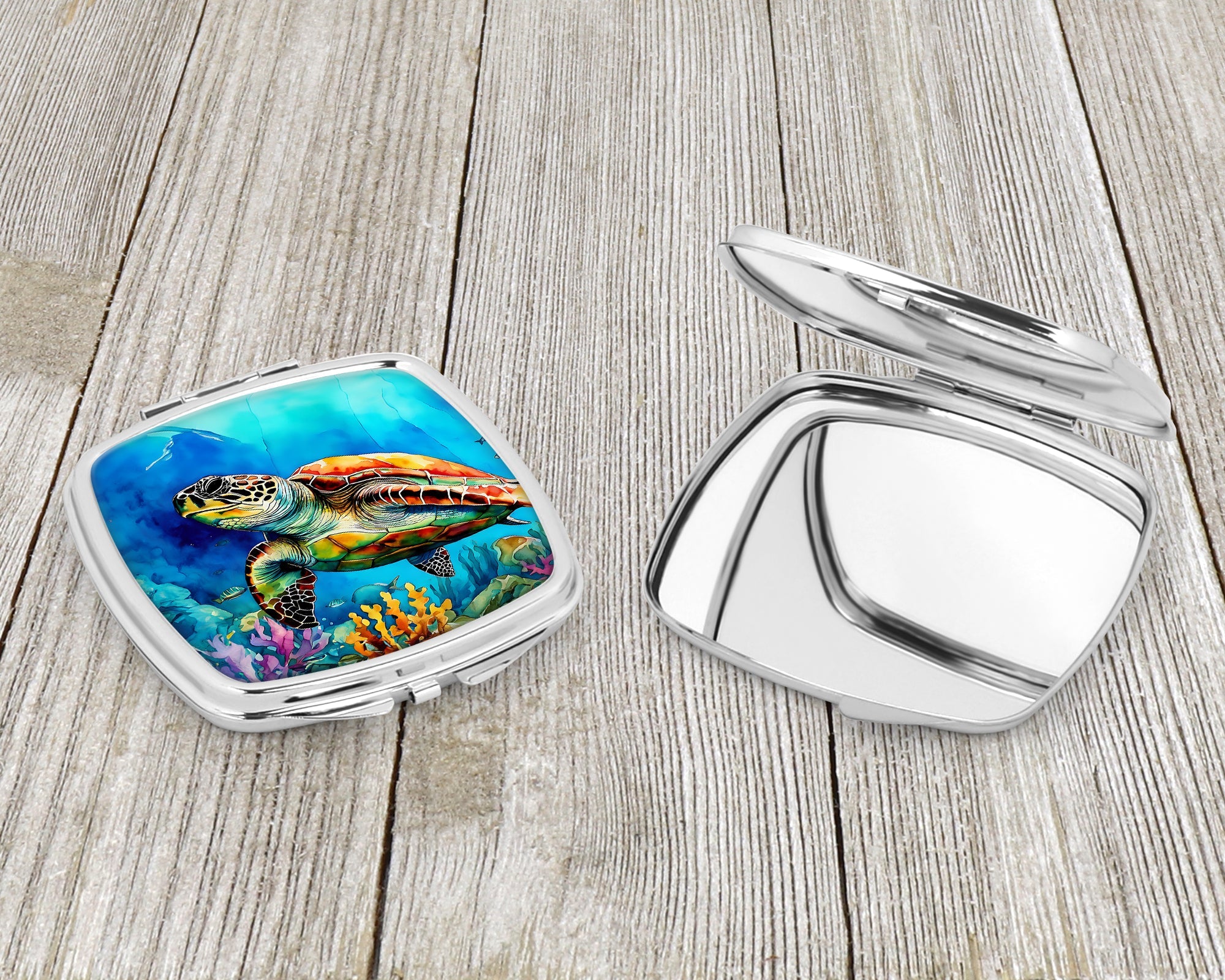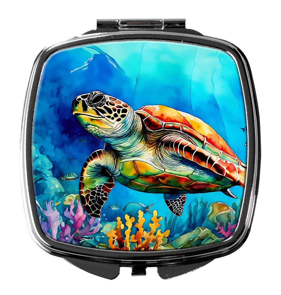 Decorate your space with our Loggerhead Sea Turtle artwork on a Compact Mirror. Introducing our Square Compact Mirror, a blend of elegance, functionality, and compactness, perfect for on-the-go touch-ups. This Silvertone metal mirror, with dimensions of 2.75 inches x 3 inches x .3 inches, fits effortlessly into your purse, handbag, or pocket, ensuring that you can check your appearance anytime, anywhere. Our compact mirror stands out with its eye-catching artwork on the front, adding a dash of style to this practical accessory. It is more than just a mirror; it's a statement piece that reflects your personality and aesthetic. When opened, this compact reveals two mirrors inside, doubling your perspective for precise touch-ups. The Silvertone metal construction ensures durability while maintaining a lightweight feel, making it an ideal everyday carry item. Whether you're rushing to a meeting, prepping for a dinner date, or just need a quick check on your look, our Square Compact Mirror is your reliable companion. Experience the perfect blend of style and practicality with this must-have accessory.