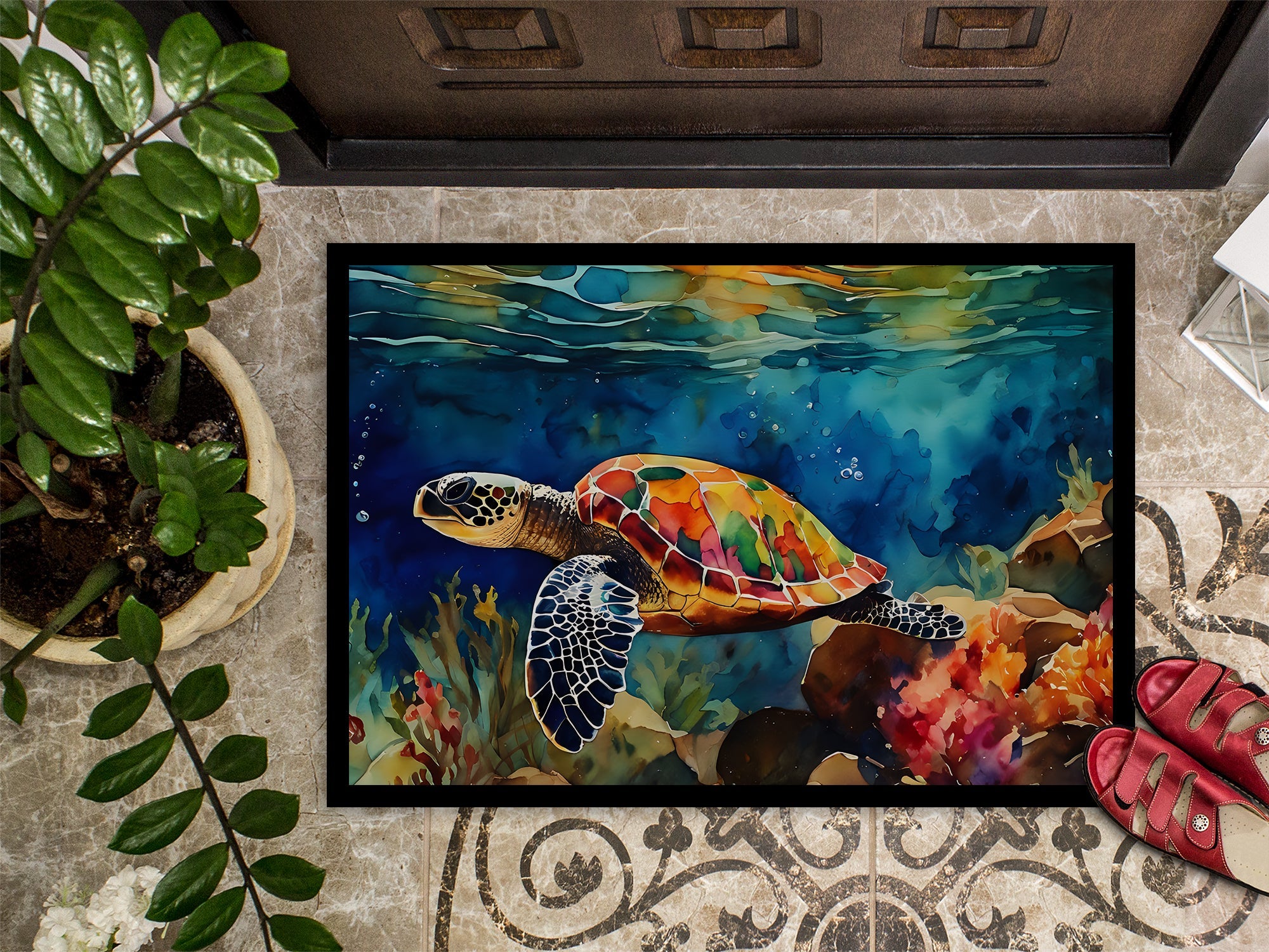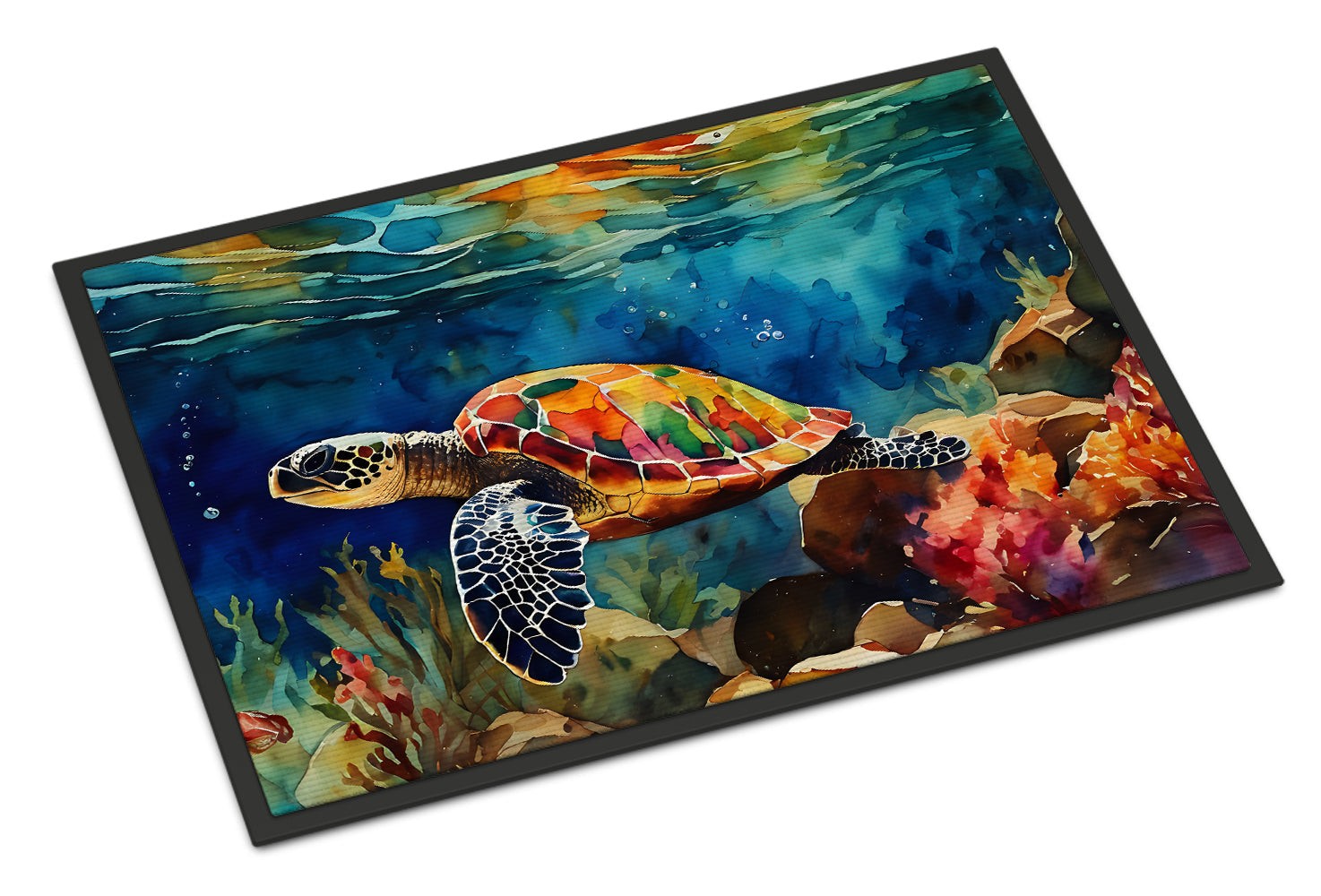 Decorate your space with our Loggerhead Sea Turtle artwork on a Doormat. Welcome your guests in style with our Artwork Door Mat, designed to withstand almost any weather condition. This mat, measuring approximately 24 by 36 inches, is held together by durable black binding tape. Its top layer, composed of polyester felt, is dyed with the eye-catching image you see on the mat. A few layers below provide the mat with stability, while its rubber bottom is stamped to help prevent slipping and ensures safety. Our mat works wonderfully as both an indoor or outdoor door mat. For cleaning, simply hose it off with water or use a power washer - no need for any cleaner that produces suds. Avoid scrubbing with a brush, instead, opt for the vacuum on floor setting. Designed manufactured and printed in the USA, this mat is a perfect addition to your porch, outdoor kitchen, entryway, or any indoor space. Its unique design makes it a charming decorative rug that greets your guests and adds a stylish touch to your home decor.