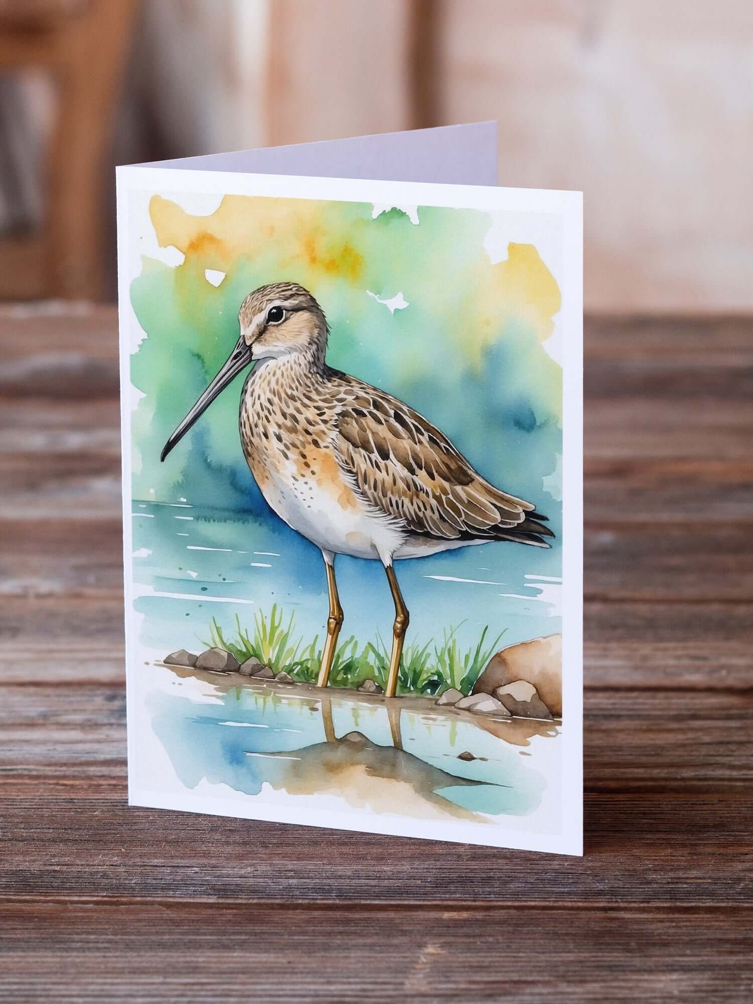 Greeting Cards Pack of 8 featuring breed specific Long-billed Dowitcher artwork. Celebrate special moments with Caroline's Treasures Printed Greeting Card Pack. This pack includes eight beautifully folded 5x7 cards, accompanied by eight matching white envelopes. With blank interiors, these cards provide ample space for your personalized messages and heartfelt holiday greetings. Each card features captivating full-color artwork, meticulously printed in our facility on high-quality 80 lb cover stock or 216 GSM. The super smooth finish of the white cards enhances the visual impact of the artwork, creating a truly stunning presentation. Designed by our talented in-house artists or licensed artists, the artwork on these cards showcases their creativity and attention to detail. From vibrant illustrations to captivating designs, each card tells its own unique story. Whether it's for birthdays, anniversaries, holidays, or any special occasion, Caroline's Treasures Greeting Card Pack is the perfect way to convey your heartfelt sentiments. Share joy, love, and warm wishes with these exquisite cards and make every moment unforgettable.