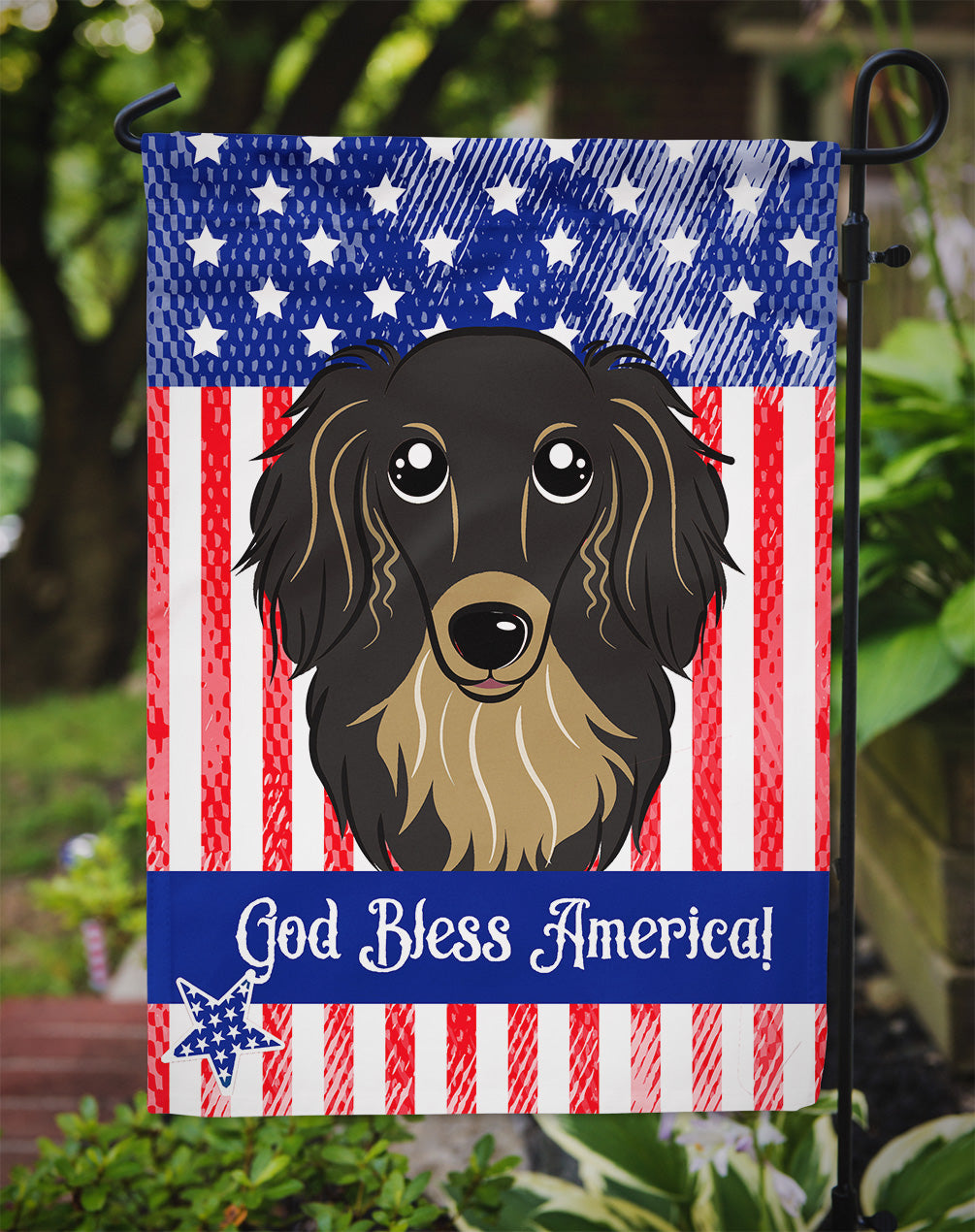 Decorate your space with our Dachshund artwork on a Garden Flag. Enhance the beauty of your garden, patio, or yard with Caroline's Treasures Decorative Garden Flag, proudly made in the USA. Crafted from two pieces of thick, double-sided polyester fabric, this 2-ply garden flag is designed to withstand various weather conditions, making it water-resistant and weatherproof. Featuring correctly readable words on both sides, this garden flag offers a delightful visual experience from any angle. With its heavier weight, it stands out among other garden flags, ensuring stability and durability even in wind, rain, and snow. Measuring approximately 11 1/4 inches by 15 1/2 inches, this flag allows you to personalize your outdoor decor. It comes with a 1 1/2-inch sleeve sewn in, allowing easy attachment to any standard garden flag stand or garden size porch hanger (sold separately). Make a statement in your outdoor space with Caroline's Treasures Decorative Garden Flag, a vibrant and high-quality flag that adds color and personality to your surroundings. Proudly made in the USA, it's a symbol of quality craftsmanship and attention to detail.