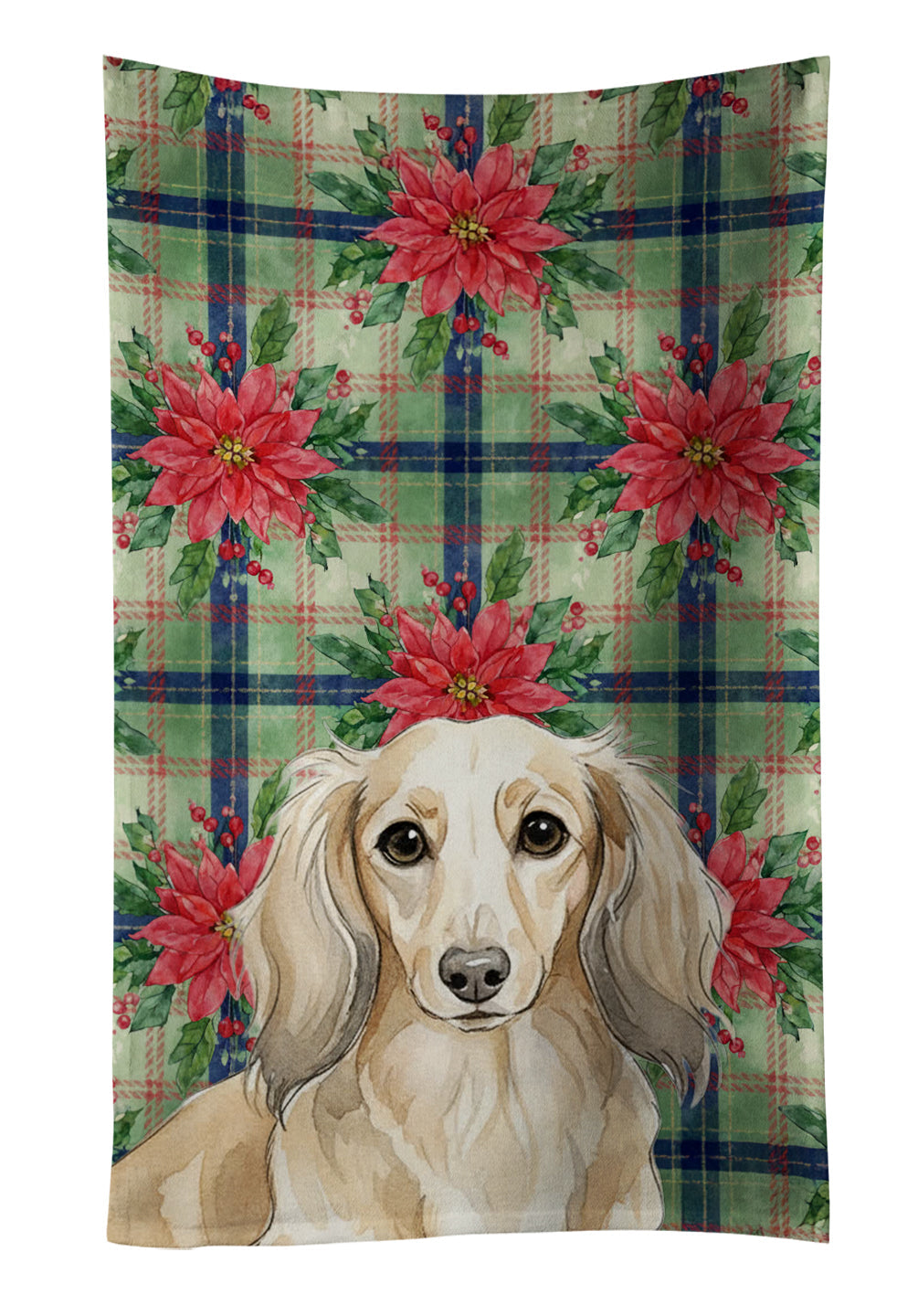 Kitchen Towel featuring breed specific Dachshund artwork. Celebrate Christmas with this Christmas Kitchen Towel. Bring cozy holiay charm to your sink or powder room with a plush velour towel featuring original watercolor artwork. The front is a soft, color-rich minky polyester that polishes glassware to a brilliant shine; the back is 100% white cotton terry loop for quick absorbency on hands, dishes, and counters. Artwork is dyed into the fibers for lasting color that won’t crack or peel. Finished edges keep the shape wash after wash. Size: 15" x 25". Machine wash; tumble dry low. Designed and printed in the USA.