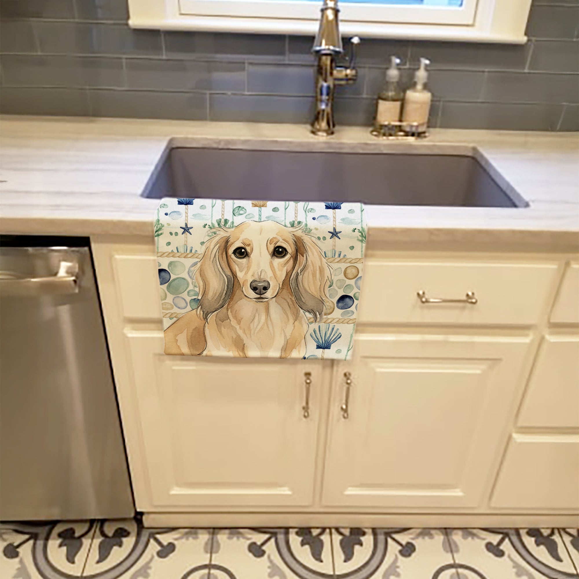 Kitchen Towel featuring breed specific Dachshund artwork. Bring breezy coastal charm to your kitchen or bath with our plush velour towel featuring original watercolor artwork. The soft minky polyester front showcases vivid seashell and starfish designs with a dog portrait, perfect for polishing glassware to a brilliant shine. The 100% cotton terry loop back delivers superior absorbency for drying hands, dishes, or counters. Artwork is dyed directly into the fibers for lasting color that won’t crack or peel. Each towel measures 15" x 25", with bound edges to maintain shape after repeated washes. Machine washable and tumble dry low for easy care. Designed and printed in the USA, these towels combine function and style—ideal for beach homes, coastal kitchens, or as thoughtful gifts.