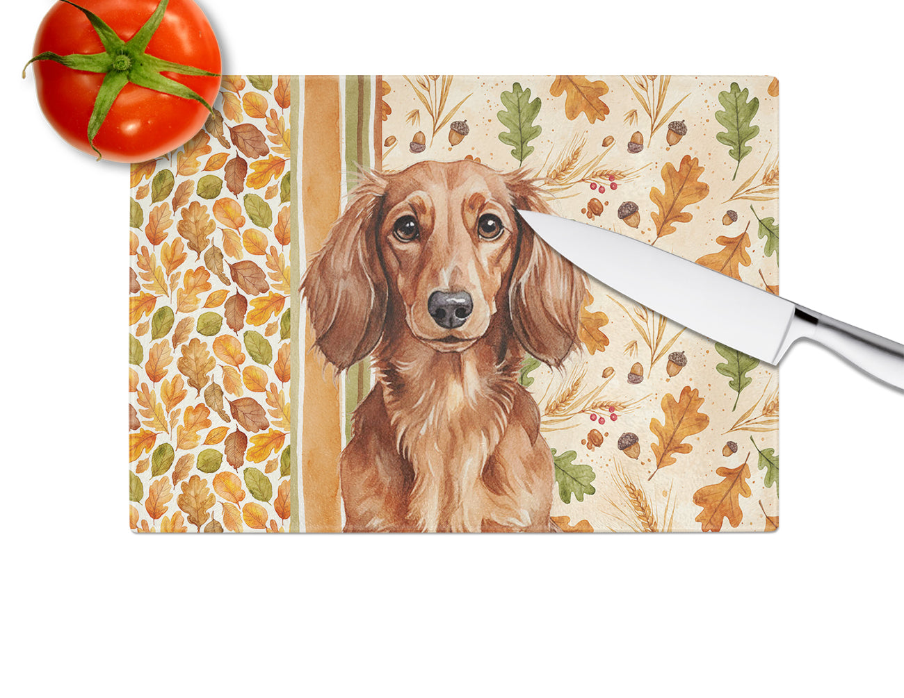 Glass Cutting Board featuring breed specific Dachshund artwork. Celebrate Thanksgiving with this Thanksgiving Cutting Board. Introduce your kitchen to the vibrant, large Decorative Glass Cutting Board from Caroline's Treasures. Crafted from resilient tempered glass, this board is not only a utilitarian necessity but also a colorful art piece. With its generous dimensions of 15 inches in height and 12 inches in length, it offers ample space for all your cutting needs. Every piece showcases captivating artwork from distinguished artists, bringing an aesthetic edge to your kitchen. Beyond its attractive design, this cutting board ensures your countertop stays pristine and unscathed, owing to its heat-resistant properties. Engineered with user convenience in mind, it features non-skid feet for stability, and rounded corners for additional safety. Its robust construction renders it virtually unbreakable, guaranteeing longevity. The board comes with protective feet bumpers, maintaining its position during use. This product is recommended to be hand washed only. Proudly printed and assembled in the United States, this cutting board exemplifies superior craftsmanship. With Caroline's Treasures' Decorative Glass Cutting Board, you're investing in a blend of functionality and artistic flair.