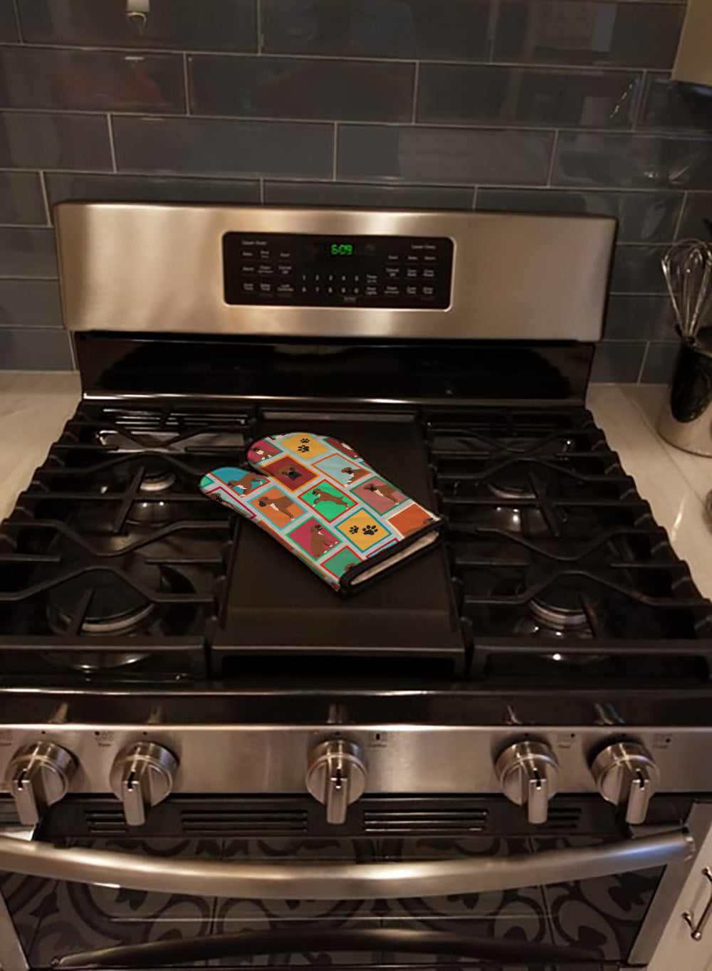 Decorate your space with our Boxer artwork on a Oven Mitt. Presenting our Large Right Hand Thick Heat Resistant Oven Mitt, an indispensable tool for any culinary enthusiast. This mitt boasts layers of quilted protection on both sides, providing outstanding resistance against extreme heat. Embellished with beautifully printed artwork, it adds an extra dash of charm to your kitchen decor. At about 12 inches long and 8 1/2 inches wide, this oven mitt offers a generous fit, accommodating a diverse range of hand sizes. Its design is enhanced by a sleek Black bias tape trim, finished with a convenient hoop for easy hanging. Fresh out of the packaging, the quilting process may give the mitt a stiff feel, but rest assured, it will soften with use and washing. Our mitt is crafted with a unique center fabric, Insul-Bright, a composite material made from polyester fibers, needle-punched through a nonwoven substrate and a reflective metallized film. This smart material resists both conduction and radiant energy, reflecting heat back to its source, all while remaining breathable. Our oven mitt is machine washable and safe for tumble drying. It's a perfect gift for your favorite Chef, BBQ enthusiast, or just a little treat for yourself! Experience safety, style, and convenience rolled into one with this exceptional oven mitt.
