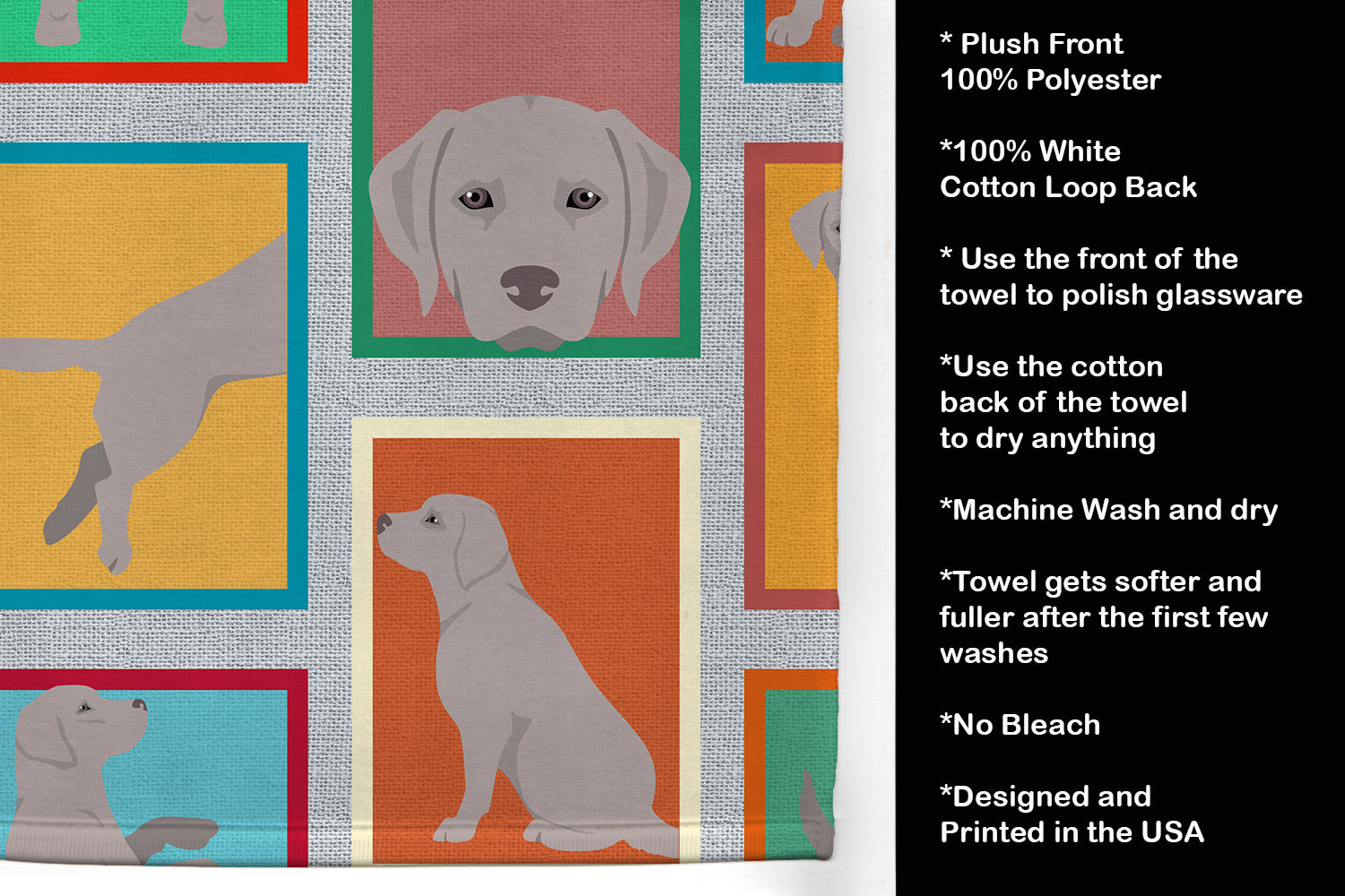 Decorate your space with our Labrador Retriever artwork on a Kitchen Towel. Experience the perfect blend of aesthetic appeal and functional excellence with our Plush Velour Kitchen Towels. These are not your ordinary decorative kitchen towels that gather dust. Instead, they are designed to be as practical as they are stylish. The front layer of our towel is constructed from a minky plush polyester, known for its durability and color retention. Unlike conventional kitchen towels, the artwork on our towels is dyed directly into the fabric, ensuring vibrant colors that last. Polish your glassware to a brilliant sparkle using the plush front side of the towel. Flip to the back, crafted from 100% cotton terry loop, to exploit its exceptional absorbency for drying dishes or wiping down counters. Our kitchen towels redefine the concept of functional art, offering lasting quality that maintains the towel's shape over time. Measuring 15 inches by 25 inches and weighing 2.3 lbs per dozen, these towels deliver an overwhelming sensory experience with their soft, plush, and smooth texture. The edges are meticulously finished with binding, enhancing their durability and visual appeal. For your convenience, these towels are machine washable and can be dried on low heat. After the first wash, the top fabric becomes even softer and fluffier, eliminating the need for ironing. Treat your kitchen to the luxury and functionality it deserves with our plush velour kitchen towels.