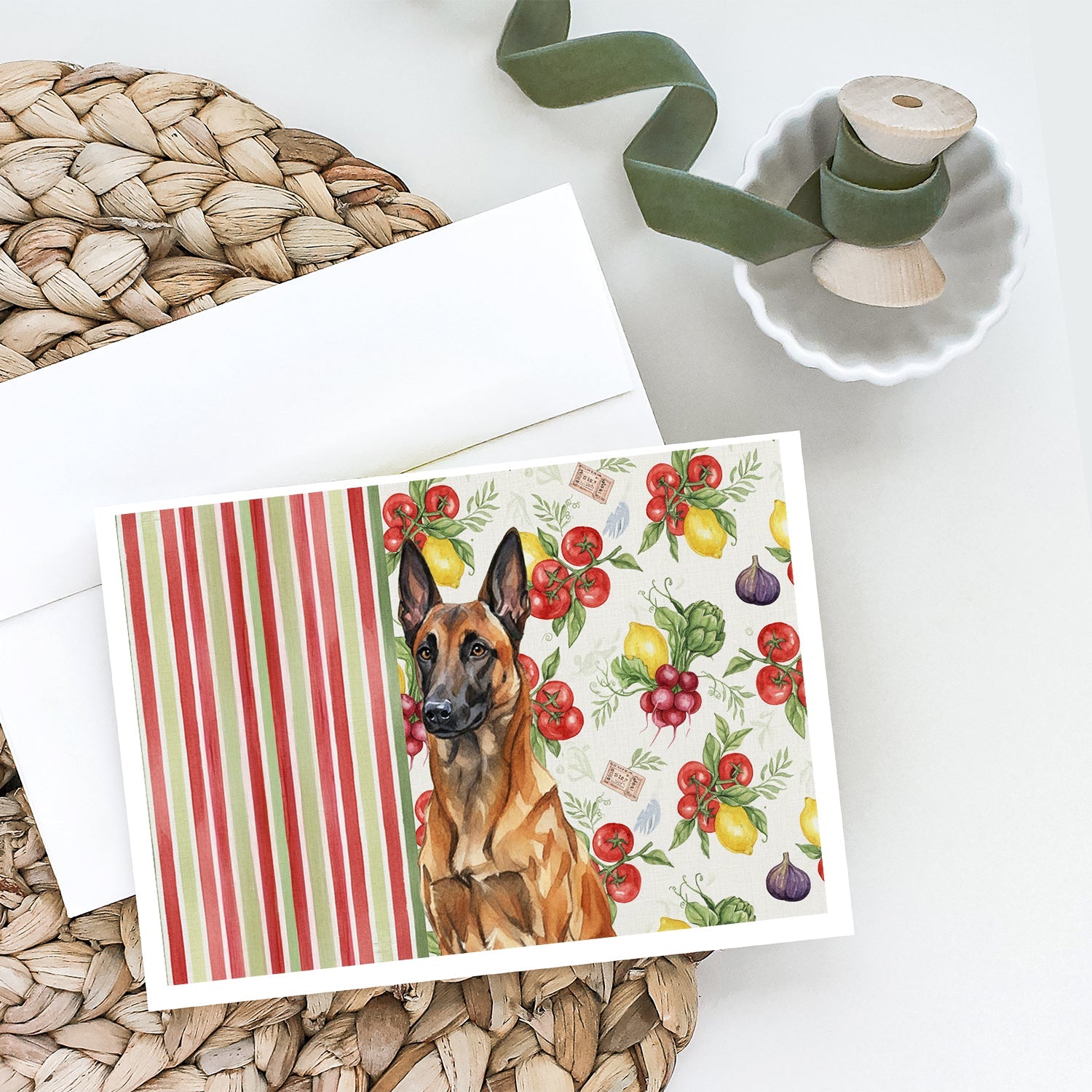 Shown here is the Mahogany Belgian Malinois Vegetables Greeting Cards Pack of 8 from Caroline's Treasures featuring artwork of a Belgian Malinois in a Everyday design. The detailed illustration and vibrant colors make it a standout accent that celebrates both seasonal style and love for the subject. This image features a vibrant watercolor vegetable pattern with tomatoes, lemons, artichokes, figs, radishes, and leafy greens arranged in a repeating design, paired with classic red and green stripes. The bright, garden-fresh palette creates a cheerful, farmhouse-inspired look that feels lively, welcoming, and perfect for kitchen décor. Everyday décor celebrates personal style and the small moments that make a house feel like home. Thoughtful designs add warmth and personality that can be enjoyed year-round. Celebrate special moments with Caroline's Treasures Printed Greeting Card Pack. This pack includes eight beautifully folded 5x7 cards, accompanied by eight matching white envelopes. With blank interiors, these cards provide ample space for your personalized messages and heartfelt holiday greetings. Each card features captivating full-color artwork, meticulously printed in our facility on high-quality 80 lb cover stock or 216 GSM. The super smooth finish of the white cards enhances the visual impact of the artwork, creating a truly stunning presentation. Designed by our talented in-house artists or licensed artists, the artwork on these cards showcases their creativity and attention to detail. From vibrant illustrations to captivating designs, each card tells its own unique story. Whether it's for birthdays, anniversaries, holidays, or any special occasion, Caroline's Treasures Greeting Card Pack is the perfect way to convey your heartfelt sentiments. Share joy, love, and warm wishes with these exquisite cards and make every moment unforgettable. Perfect for: Writing personal messages, everyday correspondence, and thoughtful notes, Dogs-themed stationery collections, or year-round use for Belgian Malinois lovers. Belgian Malinois are highly driven working dogs known for their intelligence, agility, and focus. Often used in service and protection roles, this breed is admired for its dedication and trainability. Makes a heartfelt gift for: Belgian Malinois owners, Dogs lovers, Everyday gifts, pet parents, friends who adore their Belgian Malinois, or anyone celebrating Dogs.