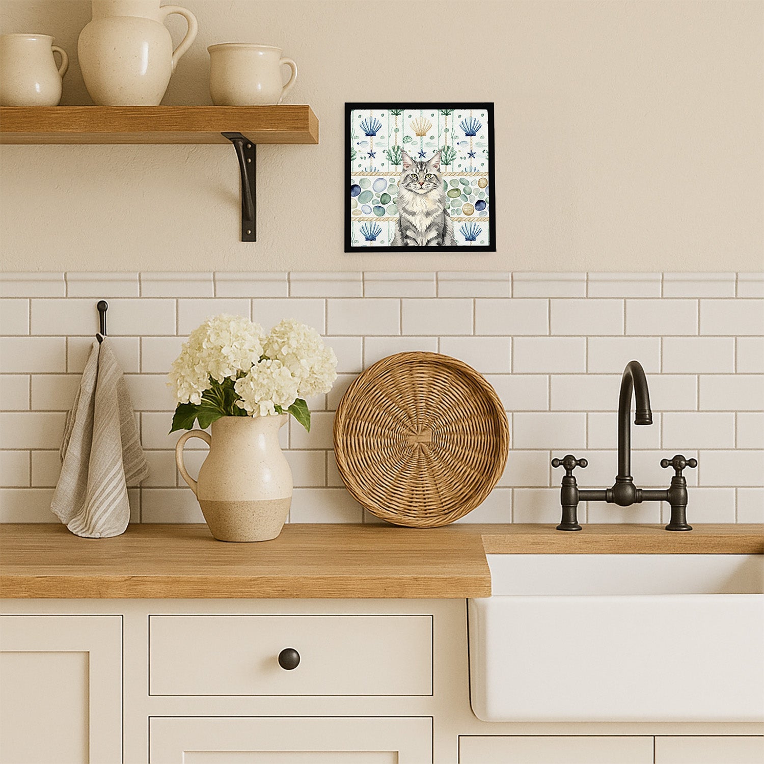 Framed Metal Print featuring breed specific MaineCoon Silver Tabby artwork. Looking for wall art that’s stylish, safe, and made to last? Our 8x8 Framed Metal Prints are designed with modern living in mind. Each piece features original artwork printed on durable aluminum, set in a sleek frame that measures 3/4 inch deep for a clean, contemporary finish. Unlike glass prints, these are lightweight, shatter-free, and family-safe. Perfect for kitchens, bathrooms, or covered porches where traditional décor might not hold up. The built-in sawtooth hanger molded into the back makes it easy to hang right out of the box—just use your own nails or screws. Cleaning is simple too: a quick wipe with a damp cloth and mild soap keeps your artwork looking vibrant. Proudly made in Alabama, every print supports our community of artists while adding personality and charm to your home.