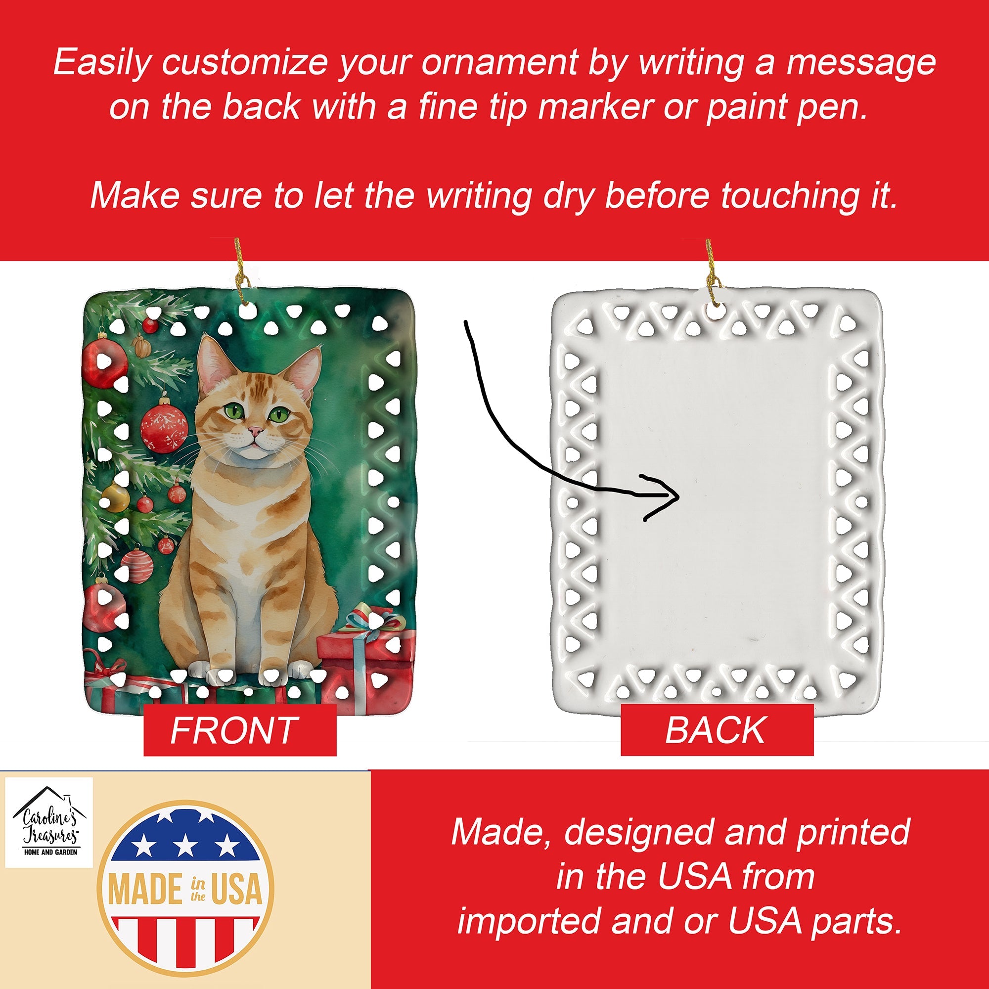 Porcelain Ornament featuring breed specific Malayan artwork. Celebrate Christmas with this Christmas Ornament. Add a unique, personal touch to your holiday decor with our Rectangular Lattice Porcelain Ornament. Perfect for creating cherished memories, this high-quality ornament shines under festive lights, reflecting warmth and joy throughout your Christmas tree. Crafted with a glossy finish, it showcases vibrant, full-color artwork contributed by our talented artists, ensuring your tree is adorned with a burst of color and holiday spirit. What sets this Porcelain Ornament apart is its customizable white back. Use a paint pen or permanent marker to write a heartfelt message, commemorate a special year, or mark an unforgettable date, turning this ornament into a keepsake that will be treasured for years to come. For best results, allow any personalization to dry thoroughly before handling. Each ornament comes complete with a delicate gold cord, making it easy to hang and display. Proudly made in the USA, this ornament measures 3.375 x 2.625 inches and is a thoughtful gift for pet sitters, teachers, family members, or anyone who would appreciate a little extra holiday magic. Bring style, charm, and a touch of personal meaning to your Christmas tree with this beautifully designed ornament..