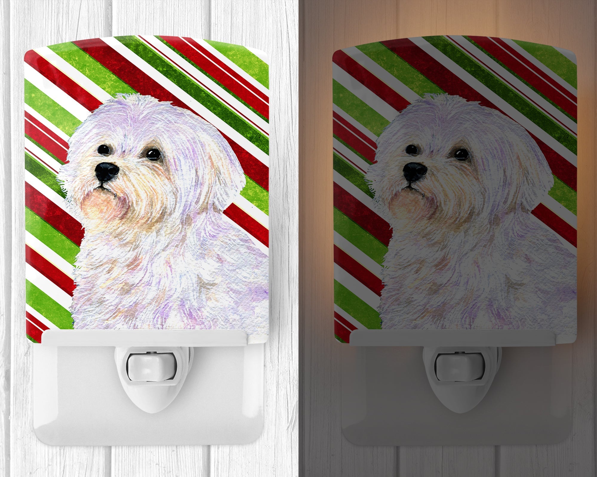 Decorate your space with our Christmas Maltese artwork on a Night Light. Introduce a splash of artistic flair and subtle illumination to your space with the Decorative Ceramic Night Light from Caroline's Treasures. Perfect for any room, this night light seamlessly blends functionality with an aesthetic appeal, offering a stylish solution to brighten up dark corners of your home or office. Boasting a six-inch high by four-inch wide ceramic tile at the front, it showcases vivid, full-color artwork from distinguished artists, transforming a simple utility into a vibrant art piece. The artwork is securely encased in a robust metal holder, ensuring durability and longevity. Two screws are provided to firmly affix the tile into the holder. The holder extends three inches deep, housing an included bulb that emits a soft, welcoming glow. This product meets all safety standards, as evidenced by its UL approval. Proudly made in the United States from imported components, this Decorative Ceramic Night Light is not just a functional device; it's a statement piece that enhances the ambiance of your surroundings.