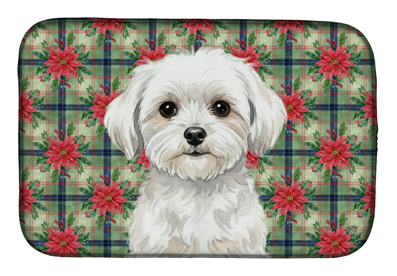 Dish Drying Mat featuring breed specific Maltese artwork. Celebrate Christmas with this Christmas Dish Drying Mat. Say goodbye to messy countertops and soggy dish towels with our innovative dish drying mat. Our high-quality dish drying pad is designed to keep your countertops dry while offering a stylish and efficient solution. Whether you're air drying dishes, glasses, stemware, silverware, pots, pans, bottles, or even fruits and vegetables, our dish mat is the perfect choice. The 14 inches x 22 inches size fits most counters and dish drying racks, and the non-slip design ensures stability. Made with water-absorbent polyester and a polyurethane foam insert, our dish drying mat is not only functional but also durable. It's machine washable and printed in the USA for long-lasting use. The beautiful artwork adds flair to your kitchen decor, making it a perfect housewarming gift or present for any occasion. Upgrade your kitchen experience with our absorbent and versatile dish drying mat.