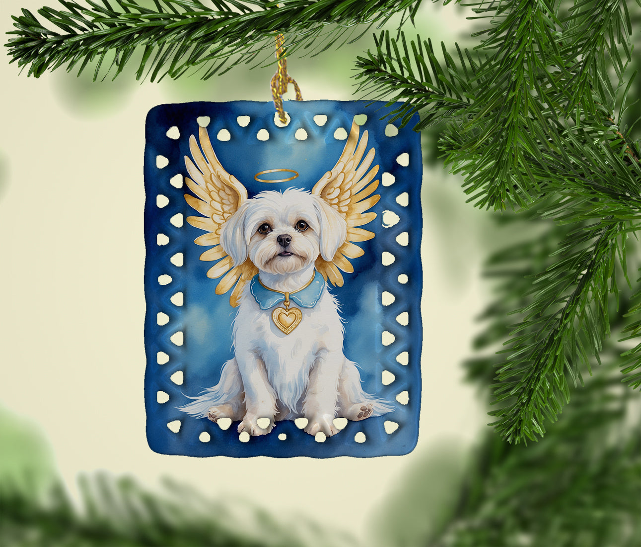 Porcelain Ornament featuring breed specific Maltese artwork. Celebrate Christmas with this Christmas Ornament. Add a unique, personal touch to your holiday decor with our Rectangular Lattice Porcelain Ornament. Perfect for creating cherished memories, this high-quality ornament shines under festive lights, reflecting warmth and joy throughout your Christmas tree. Crafted with a glossy finish, it showcases vibrant, full-color artwork contributed by our talented artists, ensuring your tree is adorned with a burst of color and holiday spirit. What sets this Porcelain Ornament apart is its customizable white back. Use a paint pen or permanent marker to write a heartfelt message, commemorate a special year, or mark an unforgettable date, turning this ornament into a keepsake that will be treasured for years to come. For best results, allow any personalization to dry thoroughly before handling. Each ornament comes complete with a delicate gold cord, making it easy to hang and display. Proudly made in the USA, this ornament measures 3.375 x 2.625 inches and is a thoughtful gift for pet sitters, teachers, family members, or anyone who would appreciate a little extra holiday magic. Bring style, charm, and a touch of personal meaning to your Christmas tree with this beautifully designed ornament..