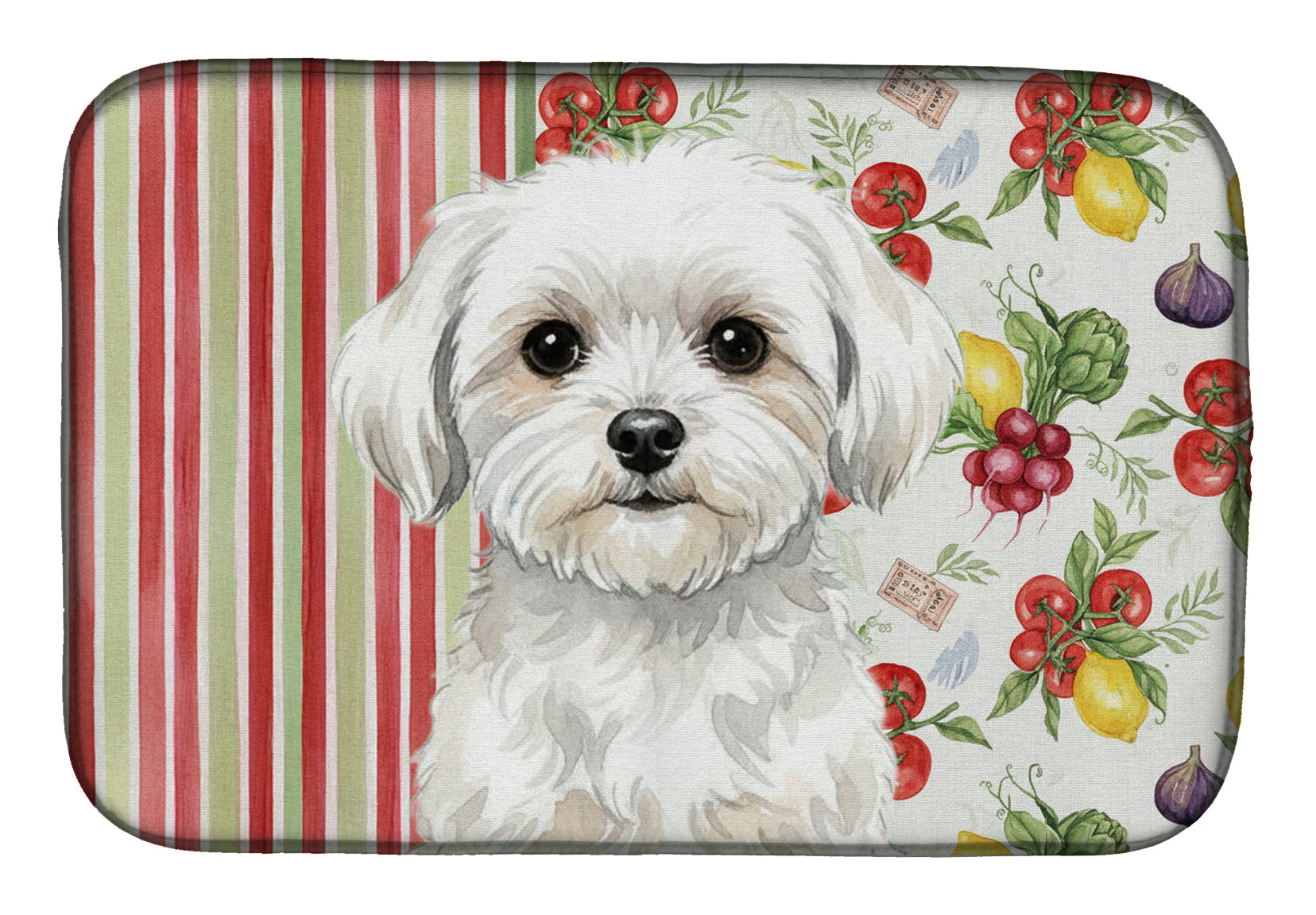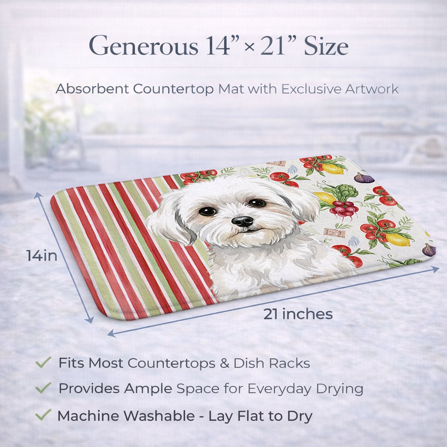 Shown here is the Maltese Vegetables Dish Drying Mat from Caroline's Treasures featuring artwork of a Maltese in a Everyday design. The detailed illustration and vibrant colors make it a standout accent that celebrates both seasonal style and love for the subject. This image features a vibrant watercolor vegetable pattern with tomatoes, lemons, artichokes, figs, radishes, and leafy greens arranged in a repeating design, paired with classic red and green stripes. The bright, garden-fresh palette creates a cheerful, farmhouse-inspired look that feels lively, welcoming, and perfect for kitchen décor. Everyday décor celebrates personal style and the small moments that make a house feel like home. Thoughtful designs add warmth and personality that can be enjoyed year-round. Say goodbye to messy countertops and soggy dish towels with our innovative dish drying mat. Our high-quality dish drying pad is designed to keep your countertops dry while offering a stylish and efficient solution. Whether you're air drying dishes, glasses, stemware, silverware, pots, pans, bottles, or even fruits and vegetables, our dish mat is the perfect choice. The 14 inches x 21 inches size fits most counters and dish drying racks, and the non-slip design ensures stability. Made with water-absorbent polyester and a polyurethane foam insert, our dish drying mat is not only functional but also durable. It's machine washable and printed in the USA for long-lasting use. The beautiful artwork adds flair to your kitchen decor, making it a perfect housewarming gift or present for any occasion. Upgrade your kitchen experience with our absorbent and versatile dish drying mat. Perfect for: Kitchen counters and sinks, everyday dish drying and countertop protection, Dogs-themed homes, or year-round use for Maltese lovers. Maltese are small companion dogs known for their gentle temperament and flowing white coats. This affectionate breed is cherished for its loyalty, intelligence, and strong attachment to its owners. Makes a heartfelt gift for: Maltese owners, Dogs lovers, Everyday gifts, pet parents, friends who adore their Maltese, or anyone celebrating Dogs.