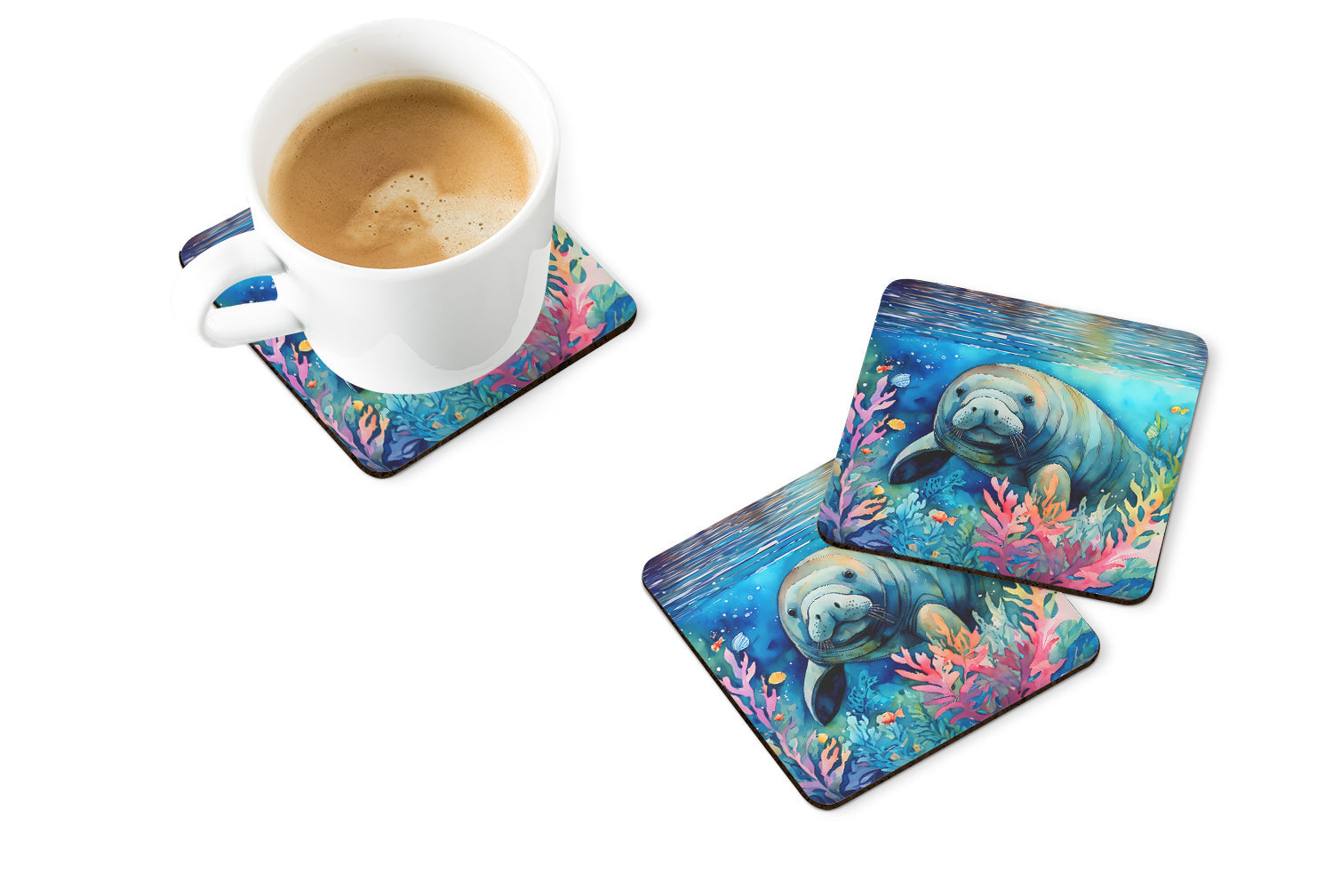 Decorate your space with our Manatee artwork on a Coaster set. Presenting our Set of 4 Foam Coasters, a stylish and practical addition to your table setting. Each square coaster, measuring 3 1/2 inches by 3 1/2 inches, is perfectly sized to accommodate various drinkware, from coffee mugs to tumblers. These coasters stand out with their full-color artwork, permanently dyed onto the material for a vibrant and fade-resistant finish. They're not just functional, they're a fashionable statement, adding a touch of flair to any gathering or event. Our foam coasters serve a dual purpose - they protect your table from water stains and are perfect for both hot and cold drinks. The material used is similar to that of our high-quality mouse pads, ensuring durability and heat resistance. These coasters are easy to maintain - simply wash them in the top of your dishwasher and lay flat to dry. The design won't come off, ensuring they retain their vivid colors for years. Pair them with one of our insulated coolers or huggers for a cohesive, thoughtful gift set. Enhance your beverage experience with our Set of 4 Foam Coasters.