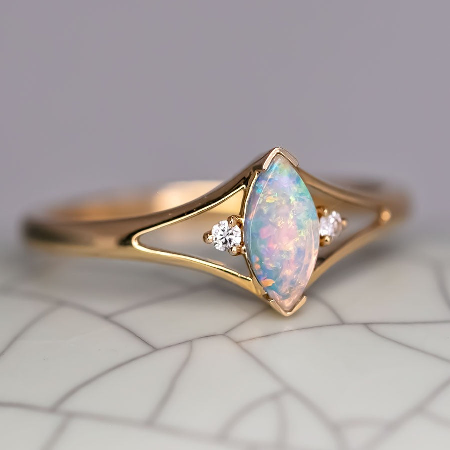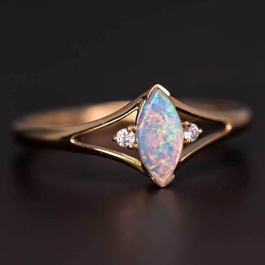 Marquise Cut Australian Solid Opal & Diamond Ring 18K Yellow Gold.