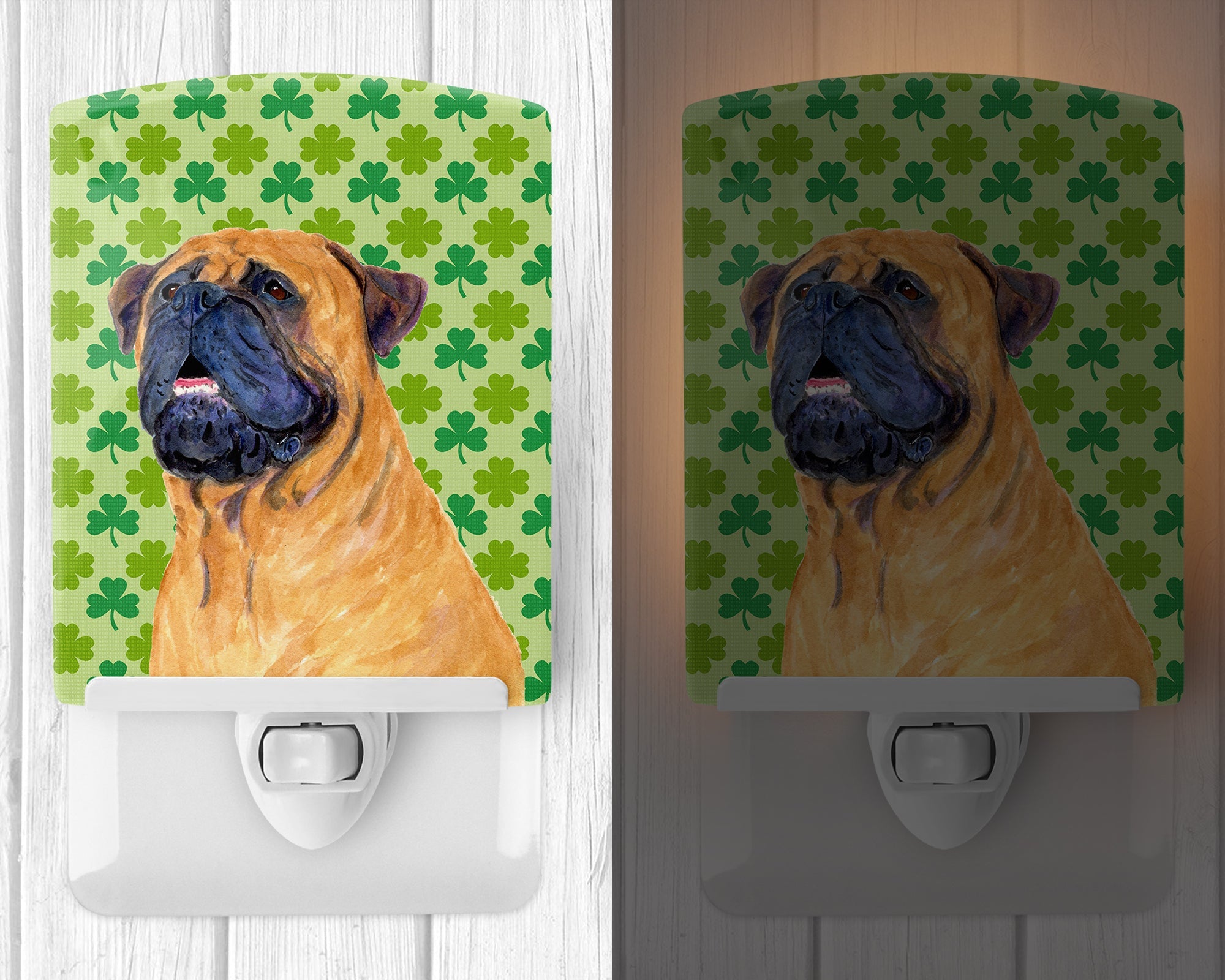 Decorate your space with our St Patrick's Day Mastiff artwork on a Night Light. Introduce a splash of artistic flair and subtle illumination to your space with the Decorative Ceramic Night Light from Caroline's Treasures. Perfect for any room, this night light seamlessly blends functionality with an aesthetic appeal, offering a stylish solution to brighten up dark corners of your home or office. Boasting a six-inch high by four-inch wide ceramic tile at the front, it showcases vivid, full-color artwork from distinguished artists, transforming a simple utility into a vibrant art piece. The artwork is securely encased in a robust metal holder, ensuring durability and longevity. Two screws are provided to firmly affix the tile into the holder. The holder extends three inches deep, housing an included bulb that emits a soft, welcoming glow. This product meets all safety standards, as evidenced by its UL approval. Proudly made in the United States from imported components, this Decorative Ceramic Night Light is not just a functional device; it's a statement piece that enhances the ambiance of your surroundings.