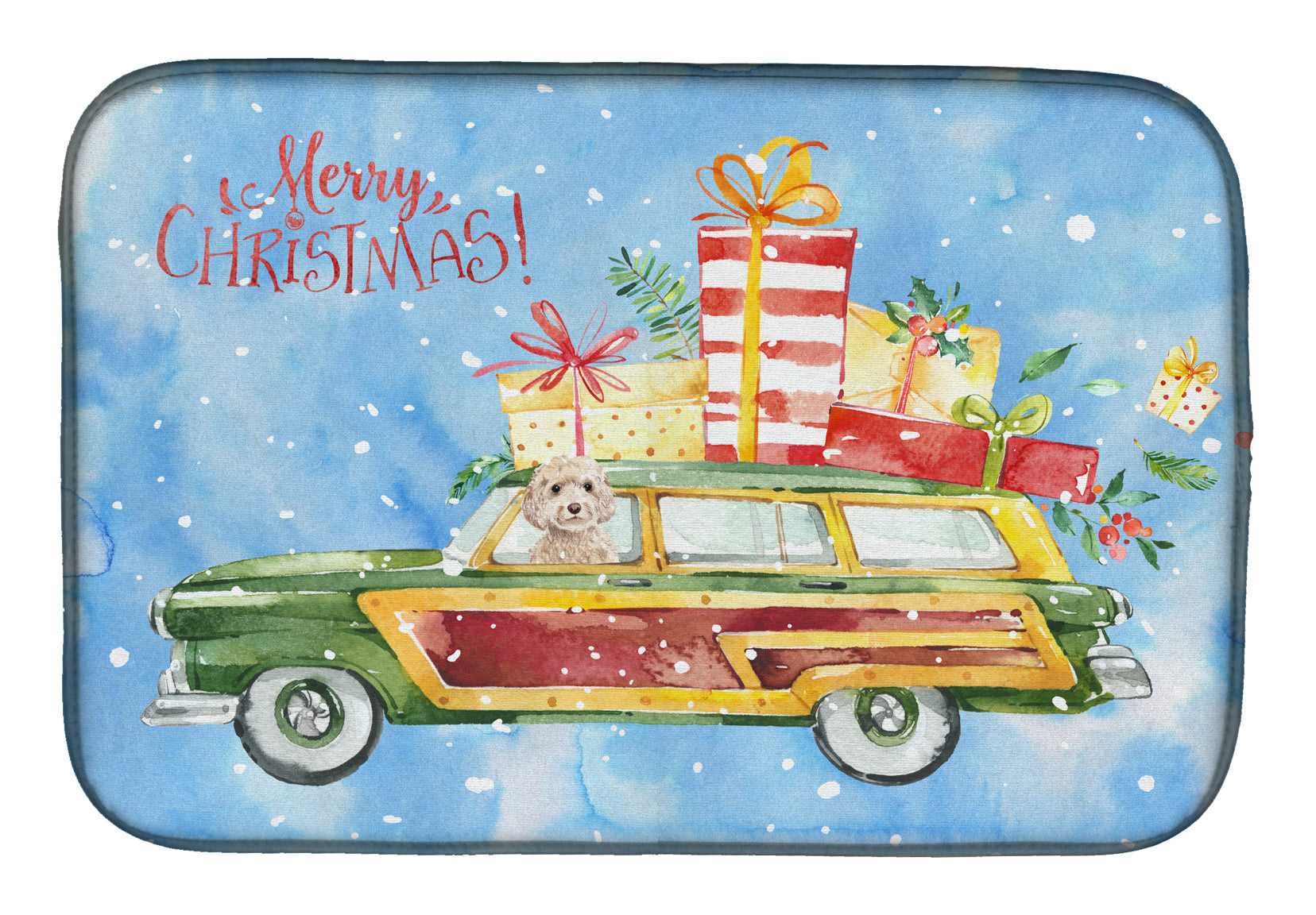 Decorate your space with our Christmas Cockapoo artwork on a Dish Drying Mat. Say goodbye to messy countertops and soggy dish towels with our innovative dish drying mat. Our high-quality dish drying pad is designed to keep your countertops dry while offering a stylish and efficient solution. Whether you're air drying dishes, glasses, stemware, silverware, pots, pans, bottles, or even fruits and vegetables, our dish mat is the perfect choice. The 14 inches x 22 inches size fits most counters and dish drying racks, and the non-slip design ensures stability. Made with water-absorbent polyester and a polyurethane foam insert, our dish drying mat is not only functional but also durable. It's machine washable and printed in the USA for long-lasting use. The beautiful artwork adds flair to your kitchen decor, making it a perfect housewarming gift or present for any occasion. Upgrade your kitchen experience with our absorbent and versatile dish drying mat.