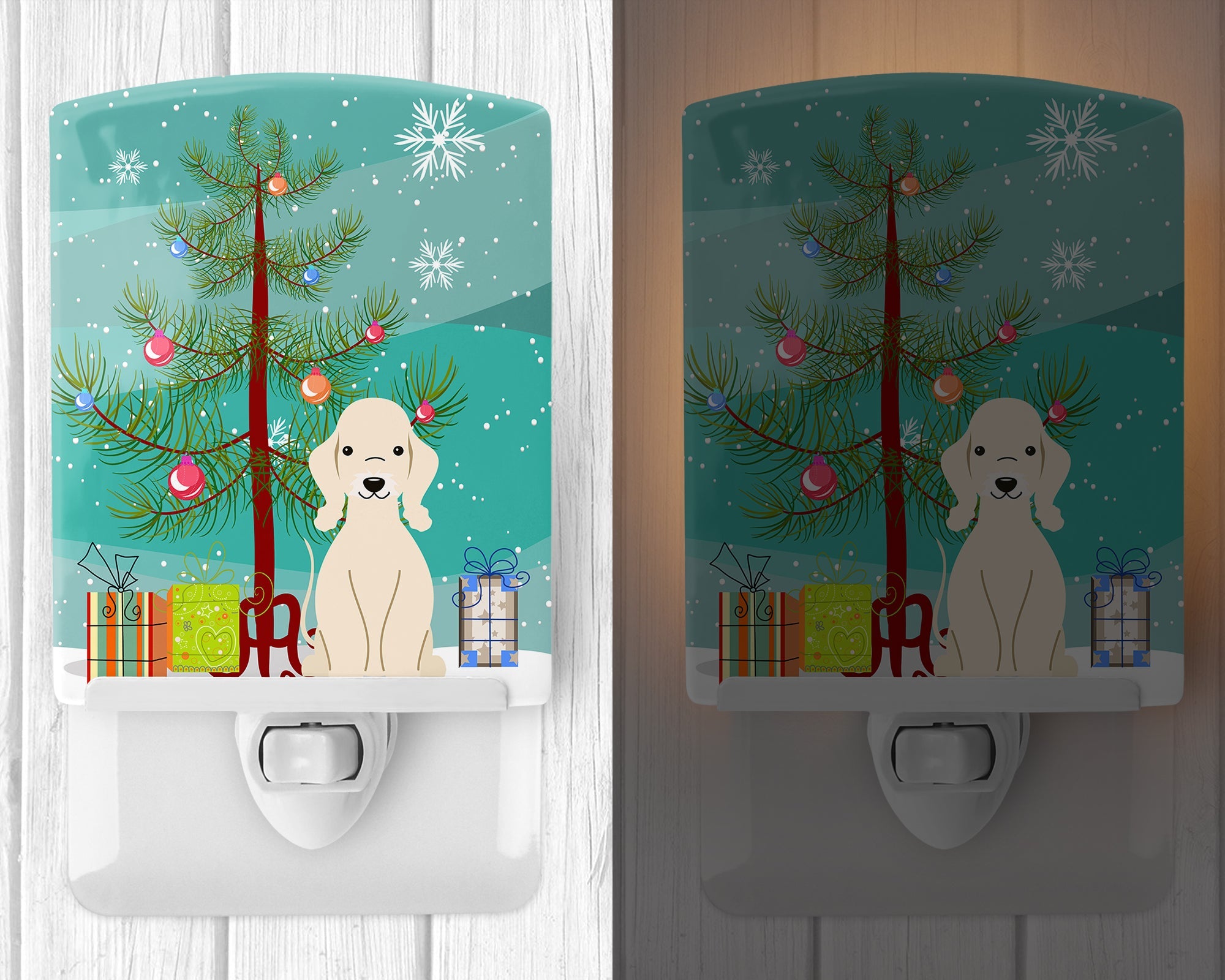 Decorate your space with our Christmas Bedlington Terrier artwork on a Night Light. Introduce a splash of artistic flair and subtle illumination to your space with the Decorative Ceramic Night Light from Caroline's Treasures. Perfect for any room, this night light seamlessly blends functionality with an aesthetic appeal, offering a stylish solution to brighten up dark corners of your home or office. Boasting a six-inch high by four-inch wide ceramic tile at the front, it showcases vivid, full-color artwork from distinguished artists, transforming a simple utility into a vibrant art piece. The artwork is securely encased in a robust metal holder, ensuring durability and longevity. Two screws are provided to firmly affix the tile into the holder. The holder extends three inches deep, housing an included bulb that emits a soft, welcoming glow. This product meets all safety standards, as evidenced by its UL approval. Proudly made in the United States from imported components, this Decorative Ceramic Night Light is not just a functional device; it's a statement piece that enhances the ambiance of your surroundings.