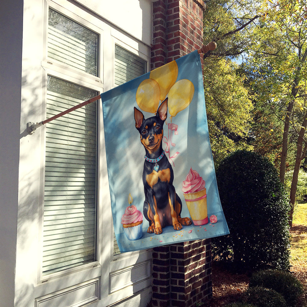 House Flag featuring breed specific Miniature Pinscher artwork. Celebrate Birthday with this Birthday Large Flag. Presenting our Heavy Duty Polyester House Size Decorative Sleeve Pole Flag, a vibrant addition to enhance the aesthetic appeal of your home. This large decorative flag, measuring approximately 28 x 40 inches, offers ample coverage and visibility. Each flag is meticulously sewn and made individually, ensuring a unique piece that may slightly vary in size. It's a sleeve pole flag, designed to fit a standard decorative flag pole effortlessly. Please note that the flag pole and bracket are not included and should be purchased separately. What sets our flag apart is its dual-sided print. The design is mirrored on both sides of the fabric, allowing for uniform visibility regardless of the angle. Printed in full color, our flag showcases vibrant hues that truly stand out. To ensure lasting vibrancy and durability, the dyes are heat-set into the fabric. This ensures your flag remains bright and captivating through various weather conditions. Elevate the look of your home with our Heavy Duty Polyester House Size Decorative Sleeve Pole Flag!