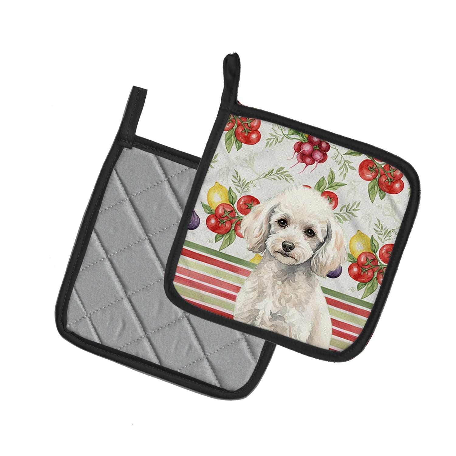 Pair of Pot Holders featuring breed specific Poodle artwork. Add warmth, personality, and function to your kitchen with our Vegetables Pot Holder Pair. Each set includes two quilted hot pads, featuring original full-color watercolor artwork on a soft polyester front accented by black trim. Crafted with multiple layers for performance: Top Layer: Vibrant artwork permanently dyed into polyester fabric. Middle Layer: US-manufactured insulated material with breathable polyester fibers and a reflective metalized film that reflects heat back to its source. Bottom Layer: A silver heat-resistant backing for extra protection. Each pot holder measures 7.5" x 7.5", includes a hanging tab, and is quilted for durability. Use them to protect your hands, countertops, and tabletops — or as decorative trivets for Thanksgiving, Christmas, or everyday meals.