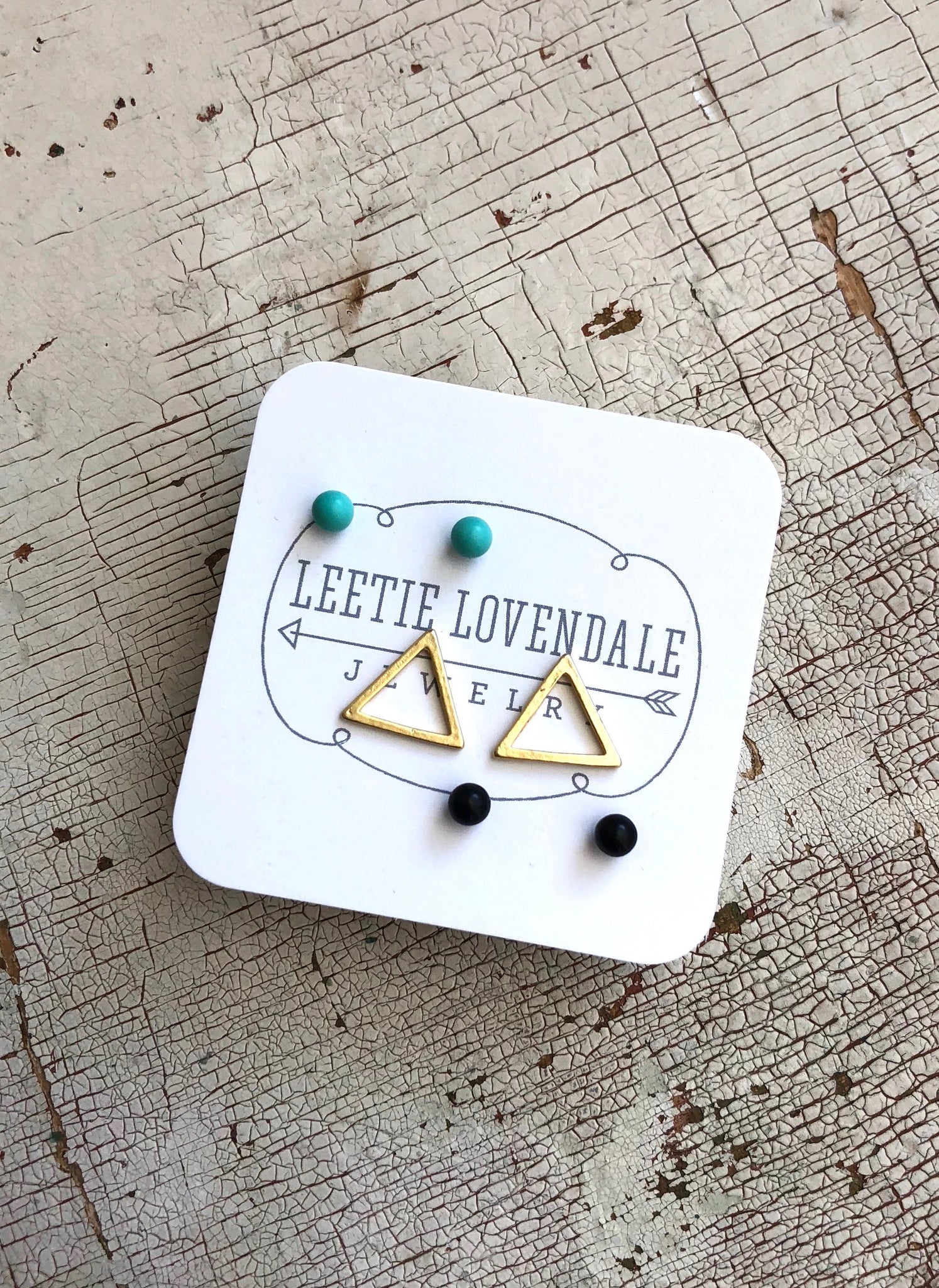 Tiny studs in Mint, Jet Black & Frosted Gold. Geometric meets minimalist. This set of earrings includes a 1mm pair of mint studs, a frosted gold geometric triangle stud, and a jet black 1mm stud. 3 pair of fabulous & fresh lucite stud or post earrings in the palette you've been looking for. The perfect retro post earring collection for gifting or expanding your own earring collection.