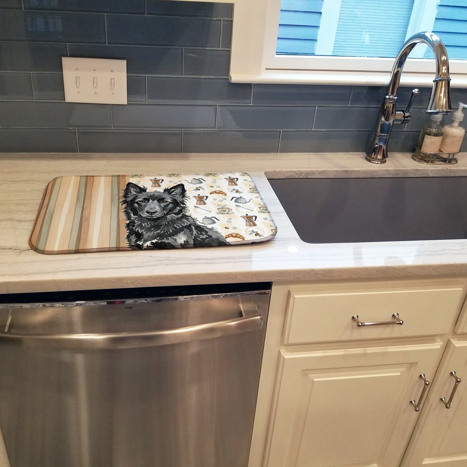 Shown here is the Mudi Coffee Bar Dish Drying Mat from Caroline's Treasures featuring artwork of a Mudi in a Everyday design. The detailed illustration and vibrant colors make it a standout accent that celebrates both seasonal style and love for the subject. This image features a cozy watercolor coffee-themed pattern with illustrated mugs, moka pots, kettles, croissants, coffee beans, and sugar cubes arranged in a repeating design. Soft neutral tones with warm browns, creams, and subtle sage accents create an inviting, café-inspired look that feels comforting and relaxed. Everyday décor celebrates personal style and the small moments that make a house feel like home. Thoughtful designs add warmth and personality that can be enjoyed year-round. Say goodbye to messy countertops and soggy dish towels with our innovative dish drying mat. Our high-quality dish drying pad is designed to keep your countertops dry while offering a stylish and efficient solution. Whether you're air drying dishes, glasses, stemware, silverware, pots, pans, bottles, or even fruits and vegetables, our dish mat is the perfect choice. The 14 inches x 21 inches size fits most counters and dish drying racks, and the non-slip design ensures stability. Made with water-absorbent polyester and a polyurethane foam insert, our dish drying mat is not only functional but also durable. It's machine washable and printed in the USA for long-lasting use. The beautiful artwork adds flair to your kitchen decor, making it a perfect housewarming gift or present for any occasion. Upgrade your kitchen experience with our absorbent and versatile dish drying mat. Perfect for: Kitchen counters and sinks, everyday dish drying and countertop protection, Dogs-themed homes, or year-round use for Mudi lovers. Mudi dogs are medium-sized with athletic builds and alert expressions. Their appearance reflects agility and intelligence. Makes a heartfelt gift for: Mudi owners, Dogs lovers, Everyday gifts, pet parents, friends who adore their Mudi, or anyone celebrating Dogs.