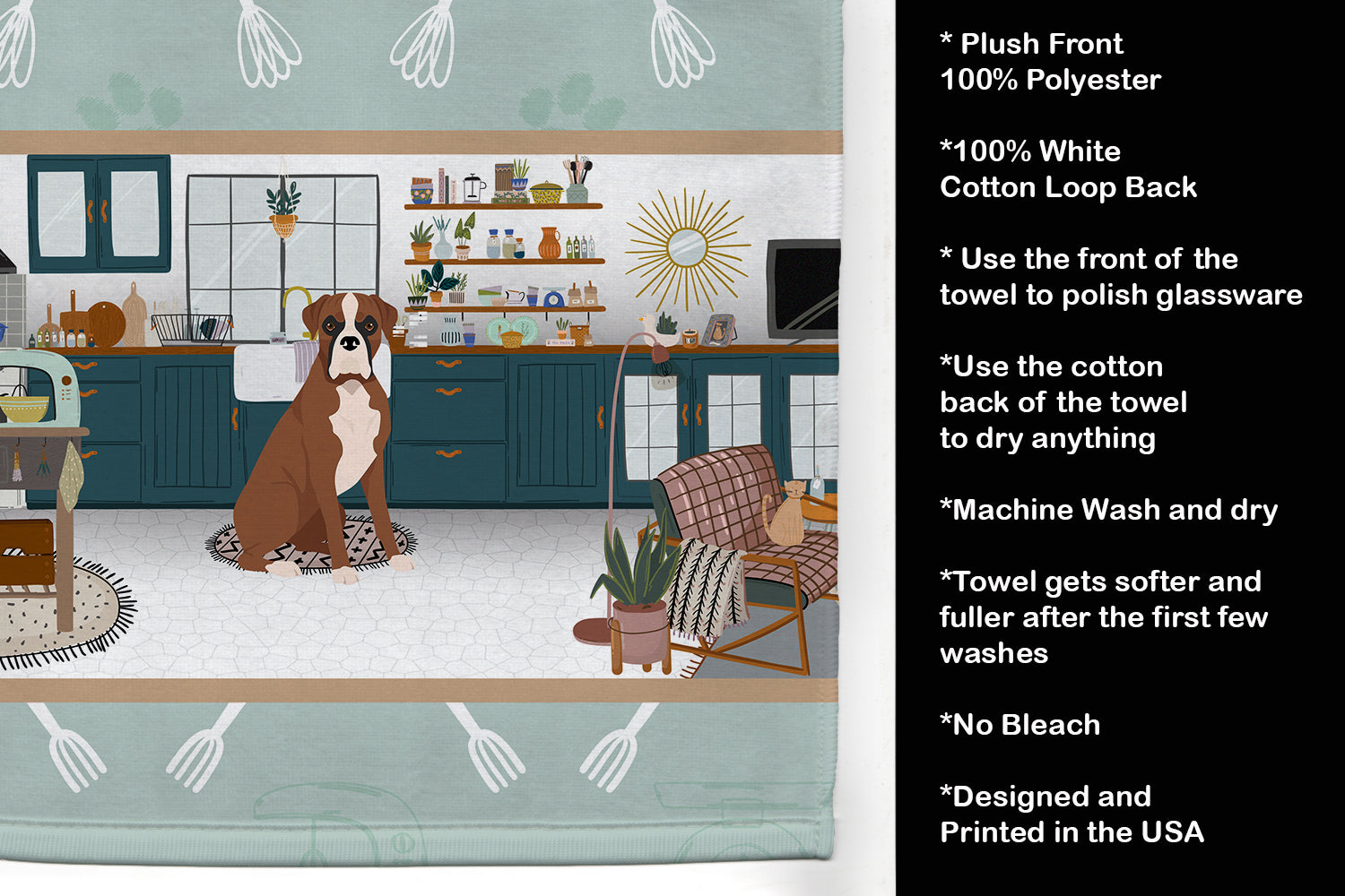 Decorate your space with our Boxer artwork on a Kitchen Towel. Experience the perfect blend of aesthetic appeal and functional excellence with our Plush Velour Kitchen Towels. These are not your ordinary decorative kitchen towels that gather dust. Instead, they are designed to be as practical as they are stylish. The front layer of our towel is constructed from a minky plush polyester, known for its durability and color retention. Unlike conventional kitchen towels, the artwork on our towels is dyed directly into the fabric, ensuring vibrant colors that last. Polish your glassware to a brilliant sparkle using the plush front side of the towel. Flip to the back, crafted from 100% cotton terry loop, to exploit its exceptional absorbency for drying dishes or wiping down counters. Our kitchen towels redefine the concept of functional art, offering lasting quality that maintains the towel's shape over time. Measuring 15 inches by 25 inches and weighing 2.3 lbs per dozen, these towels deliver an overwhelming sensory experience with their soft, plush, and smooth texture. The edges are meticulously finished with binding, enhancing their durability and visual appeal. For your convenience, these towels are machine washable and can be dried on low heat. After the first wash, the top fabric becomes even softer and fluffier, eliminating the need for ironing. Treat your kitchen to the luxury and functionality it deserves with our plush velour kitchen towels.