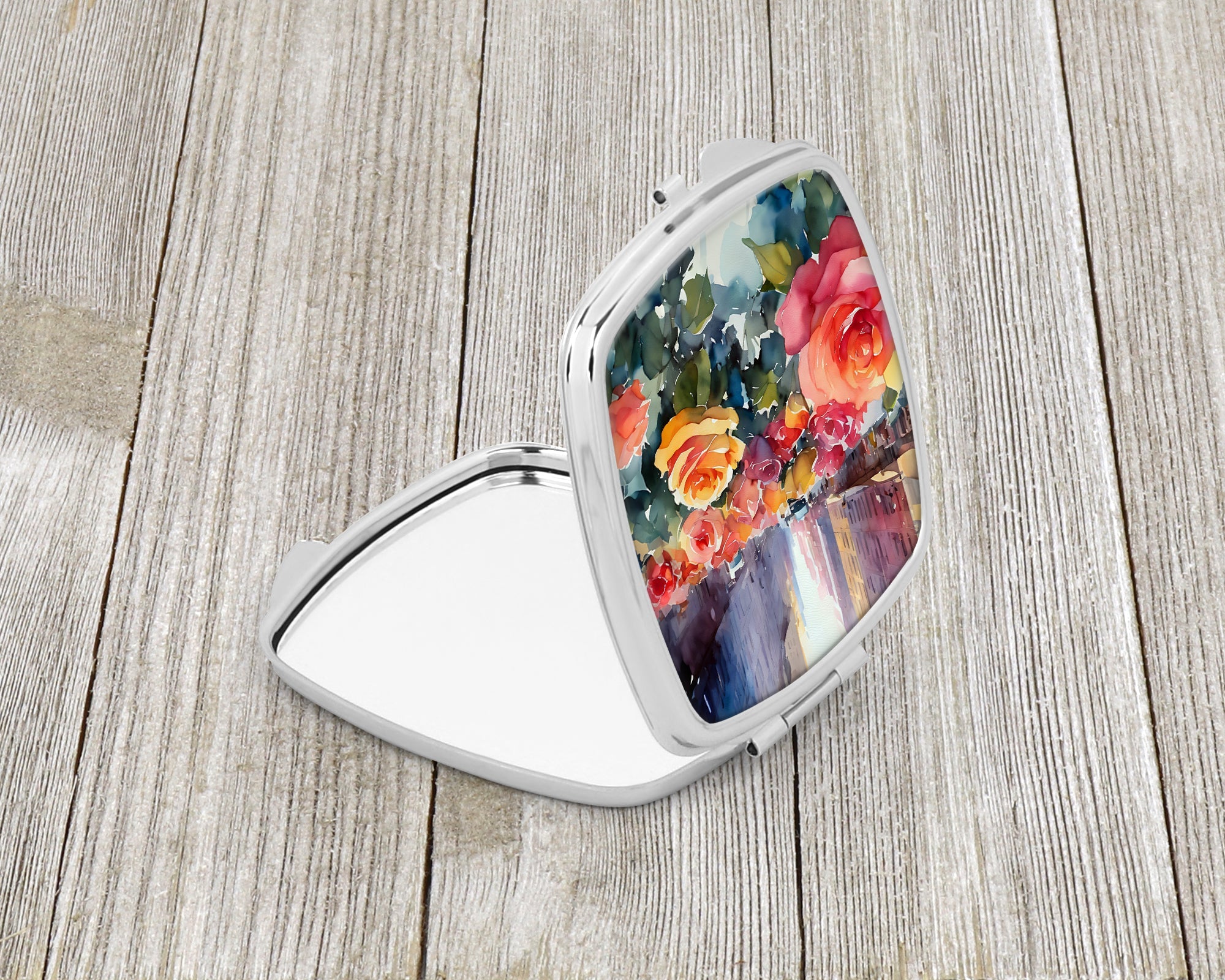 Compact Mirror featuring breed specific New York Roses artwork. Introducing our Square Compact Mirror, a blend of elegance, functionality, and compactness, perfect for on-the-go touch-ups. This Silvertone metal mirror, with dimensions of 2.75 inches x 3 inches x .3 inches, fits effortlessly into your purse, handbag, or pocket, ensuring that you can check your appearance anytime, anywhere. Our compact mirror stands out with its eye-catching artwork on the front, adding a dash of style to this practical accessory. It is more than just a mirror; it's a statement piece that reflects your personality and aesthetic. When opened, this compact reveals two mirrors inside, doubling your perspective for precise touch-ups. The Silvertone metal construction ensures durability while maintaining a lightweight feel, making it an ideal everyday carry item. Whether you're rushing to a meeting, prepping for a dinner date, or just need a quick check on your look, our Square Compact Mirror is your reliable companion. Experience the perfect blend of style and practicality with this must-have accessory.