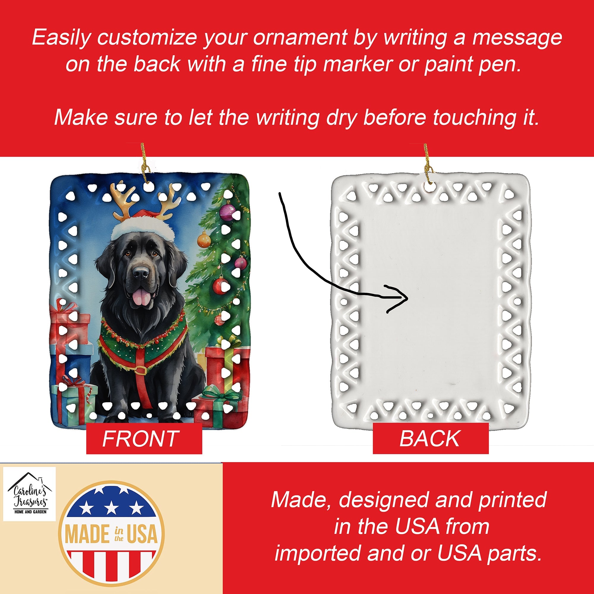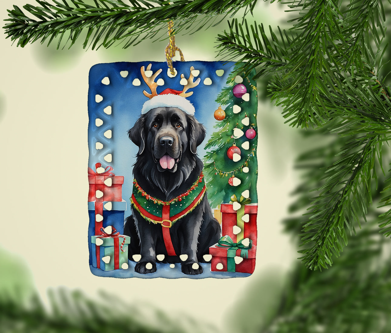Porcelain Ornament featuring breed specific Newfoundland artwork. Celebrate Christmas with this Christmas Ornament. Add a unique, personal touch to your holiday decor with our Rectangular Lattice Porcelain Ornament. Perfect for creating cherished memories, this high-quality ornament shines under festive lights, reflecting warmth and joy throughout your Christmas tree. Crafted with a glossy finish, it showcases vibrant, full-color artwork contributed by our talented artists, ensuring your tree is adorned with a burst of color and holiday spirit. What sets this Porcelain Ornament apart is its customizable white back. Use a paint pen or permanent marker to write a heartfelt message, commemorate a special year, or mark an unforgettable date, turning this ornament into a keepsake that will be treasured for years to come. For best results, allow any personalization to dry thoroughly before handling. Each ornament comes complete with a delicate gold cord, making it easy to hang and display. Proudly made in the USA, this ornament measures 3.375 x 2.625 inches and is a thoughtful gift for pet sitters, teachers, family members, or anyone who would appreciate a little extra holiday magic. Bring style, charm, and a touch of personal meaning to your Christmas tree with this beautifully designed ornament..