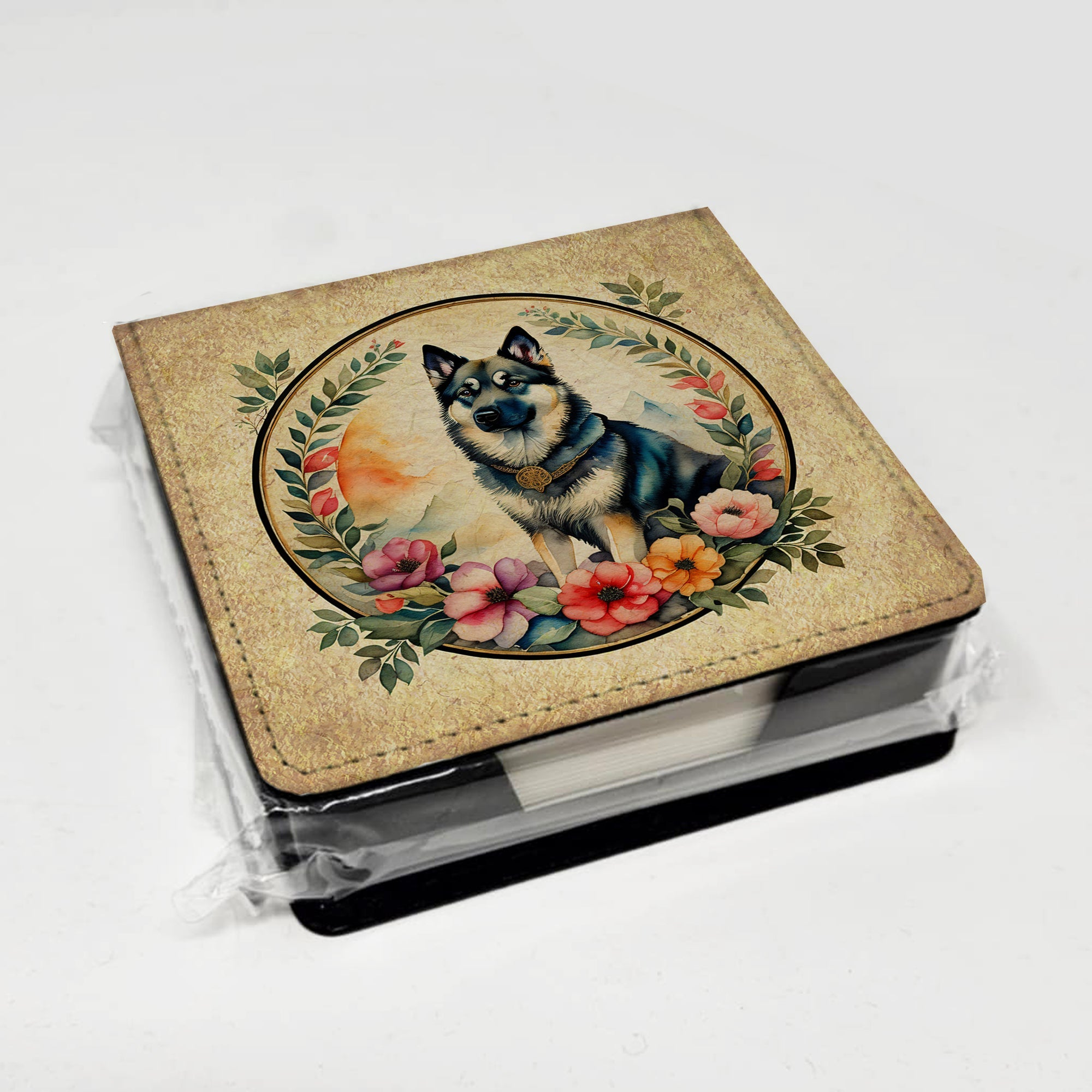 PU Leather Note Paper Holder featuring breed specific Norwegian Elkhound artwork. Elevate your workspace with this PU Leather Note Paper Holder, crafted to resemble luxurious leather without the use of animal products. Made from durable synthetic PU leather, it offers both a premium look and eco-friendly appeal. This note holder, compactly sized at 4.25 x 4.25 x 1.25 inches, includes about 160 sheets of 3.75 x 3.75-inch note paper—ideal for quick notes and reminders. An exclusive artist-designed cover makes each holder uniquely vibrant, adding a splash of color and personality to any desk or office. The discrete design keeps note paper hidden, maintaining a neat and organized workspace. Perfect as a gift or for personal use, this stylish holder is refillable with standard paper, ensuring long-lasting utility. A must-have for anyone seeking a sophisticated, artful touch to their workspace while supporting animal-friendly products. Add style, organization, and creativity to your everyday routine with this elegant note paper holder.