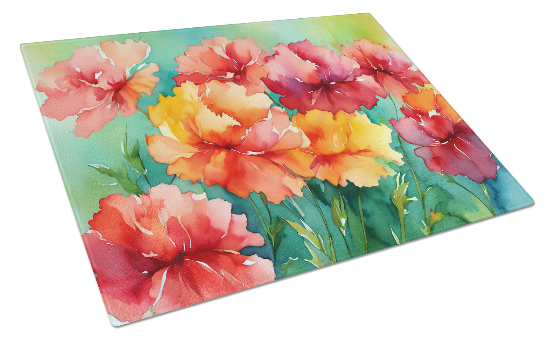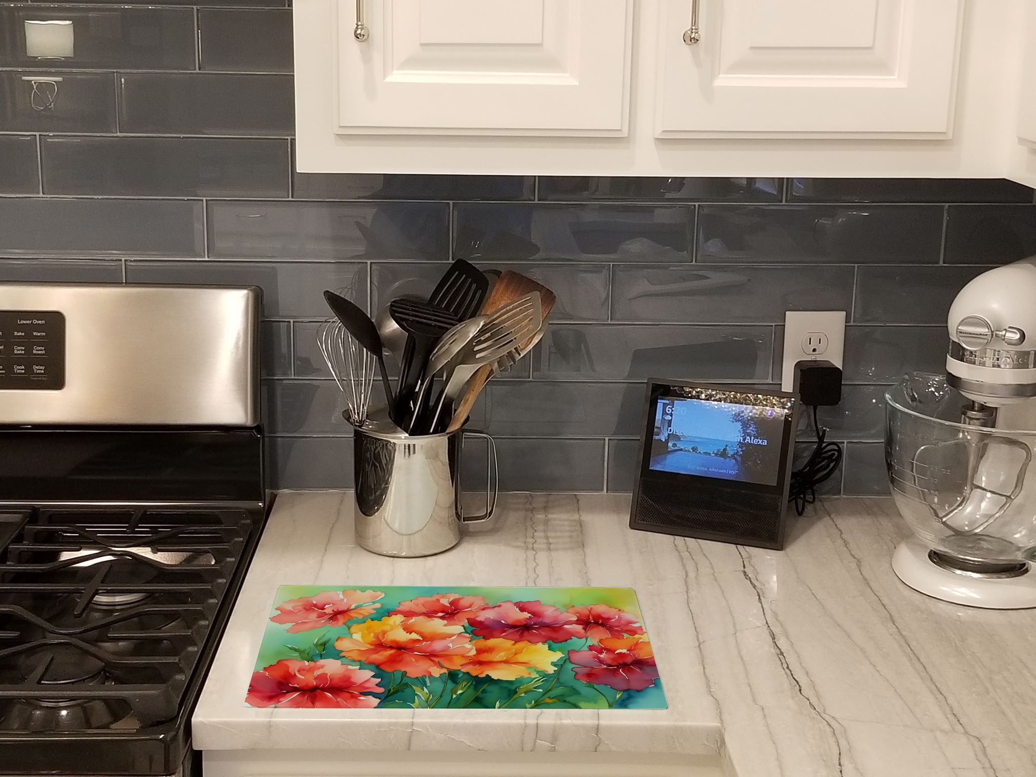 Decorate your space with our Ohio Scarlet Carnations artwork on a Cutting Board. Introduce your kitchen to the vibrant, large Decorative Glass Cutting Board from Caroline's Treasures. Crafted from resilient tempered glass, this board is not only a utilitarian necessity but also a colorful art piece. With its generous dimensions of 15 inches in height and 12 inches in length, it offers ample space for all your cutting needs. Every piece showcases captivating artwork from distinguished artists, bringing an aesthetic edge to your kitchen. Beyond its attractive design, this cutting board ensures your countertop stays pristine and unscathed, owing to its heat-resistant properties. Engineered with user convenience in mind, it features non-skid feet for stability, and rounded corners for additional safety. Its robust construction renders it virtually unbreakable, guaranteeing longevity. The board comes with protective feet bumpers, maintaining its position during use. This product is recommended to be hand washed only. Proudly printed and assembled in the United States, this cutting board exemplifies superior craftsmanship. With Caroline's Treasures' Decorative Glass Cutting Board, you're investing in a blend of functionality and artistic flair.