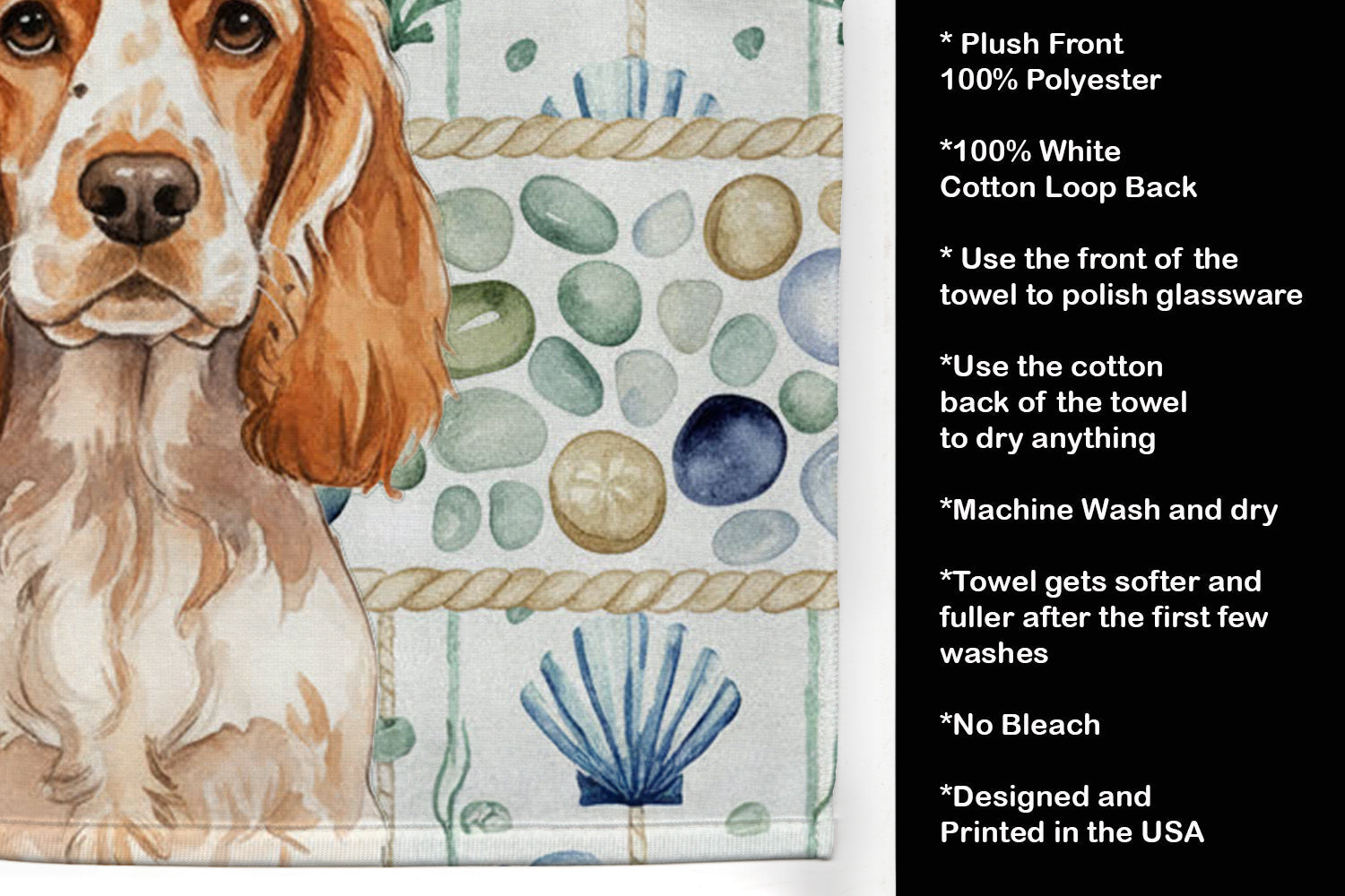 Kitchen Towel featuring breed specific English Cocker Spaniel artwork. Bring breezy coastal charm to your kitchen or bath with our plush velour towel featuring original watercolor artwork. The soft minky polyester front showcases vivid seashell and starfish designs with a dog portrait, perfect for polishing glassware to a brilliant shine. The 100% cotton terry loop back delivers superior absorbency for drying hands, dishes, or counters. Artwork is dyed directly into the fibers for lasting color that won’t crack or peel. Each towel measures 15" x 25", with bound edges to maintain shape after repeated washes. Machine washable and tumble dry low for easy care. Designed and printed in the USA, these towels combine function and style—ideal for beach homes, coastal kitchens, or as thoughtful gifts.