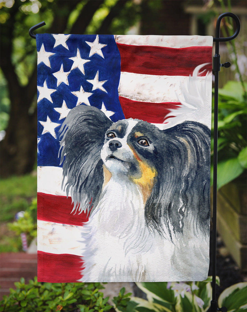 Decorate your space with our Papillon artwork on a Garden Flag. Enhance the beauty of your garden, patio, or yard with Caroline's Treasures Decorative Garden Flag, proudly made in the USA. Crafted from two pieces of thick, double-sided polyester fabric, this 2-ply garden flag is designed to withstand various weather conditions, making it water-resistant and weatherproof. Featuring correctly readable words on both sides, this garden flag offers a delightful visual experience from any angle. With its heavier weight, it stands out among other garden flags, ensuring stability and durability even in wind, rain, and snow. Measuring approximately 11 1/4 inches by 15 1/2 inches, this flag allows you to personalize your outdoor decor. It comes with a 1 1/2-inch sleeve sewn in, allowing easy attachment to any standard garden flag stand or garden size porch hanger (sold separately). Make a statement in your outdoor space with Caroline's Treasures Decorative Garden Flag, a vibrant and high-quality flag that adds color and personality to your surroundings. Proudly made in the USA, it's a symbol of quality craftsmanship and attention to detail.