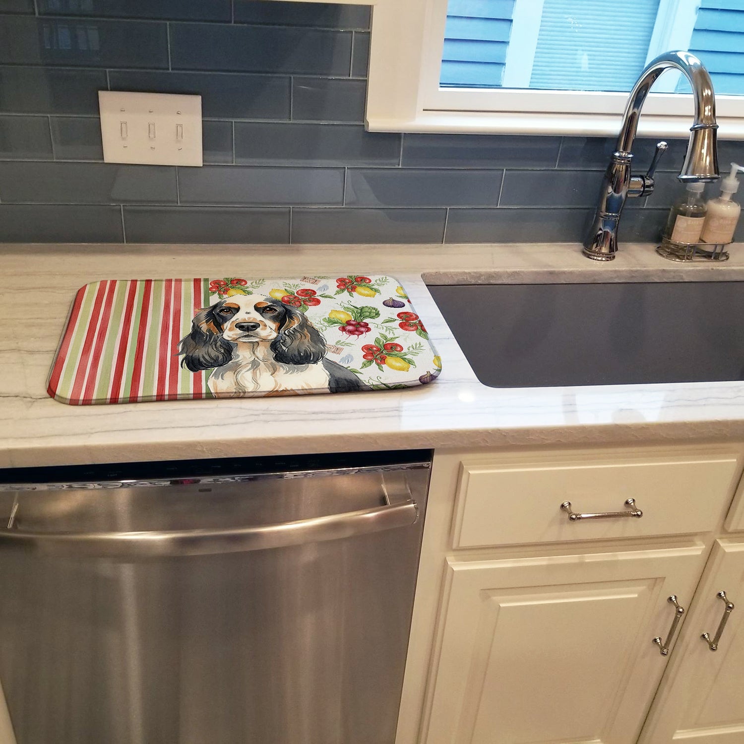 Shown here is the Parti Cocker Spaniel Vegetables Dish Drying Mat from Caroline's Treasures featuring artwork of a Cocker Spaniel in a Everyday design. The detailed illustration and vibrant colors make it a standout accent that celebrates both seasonal style and love for the subject. This image features a vibrant watercolor vegetable pattern with tomatoes, lemons, artichokes, figs, radishes, and leafy greens arranged in a repeating design, paired with classic red and green stripes. The bright, garden-fresh palette creates a cheerful, farmhouse-inspired look that feels lively, welcoming, and perfect for kitchen décor. Everyday décor celebrates personal style and the small moments that make a house feel like home. Thoughtful designs add warmth and personality that can be enjoyed year-round. Say goodbye to messy countertops and soggy dish towels with our innovative dish drying mat. Our high-quality dish drying pad is designed to keep your countertops dry while offering a stylish and efficient solution. Whether you're air drying dishes, glasses, stemware, silverware, pots, pans, bottles, or even fruits and vegetables, our dish mat is the perfect choice. The 14 inches x 21 inches size fits most counters and dish drying racks, and the non-slip design ensures stability. Made with water-absorbent polyester and a polyurethane foam insert, our dish drying mat is not only functional but also durable. It's machine washable and printed in the USA for long-lasting use. The beautiful artwork adds flair to your kitchen decor, making it a perfect housewarming gift or present for any occasion. Upgrade your kitchen experience with our absorbent and versatile dish drying mat. Perfect for: Kitchen counters and sinks, everyday dish drying and countertop protection, Dogs-themed homes, or year-round use for Cocker Spaniel lovers. Cocker Spaniels are gentle sporting dogs known for their expressive eyes and affectionate temperament. This breed is admired for its loyalty, intelligence, and friendly disposition. Makes a heartfelt gift for: Cocker Spaniel owners, Dogs lovers, Everyday gifts, pet parents, friends who adore their Cocker Spaniel, or anyone celebrating Dogs.