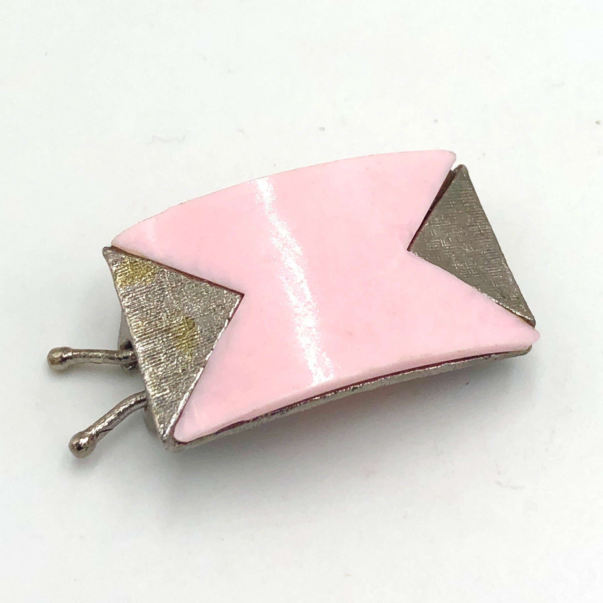 Pink lucite meets brass in this Art Deco style click-to-close barrette. Athentic vintage and each shows some age or patina.