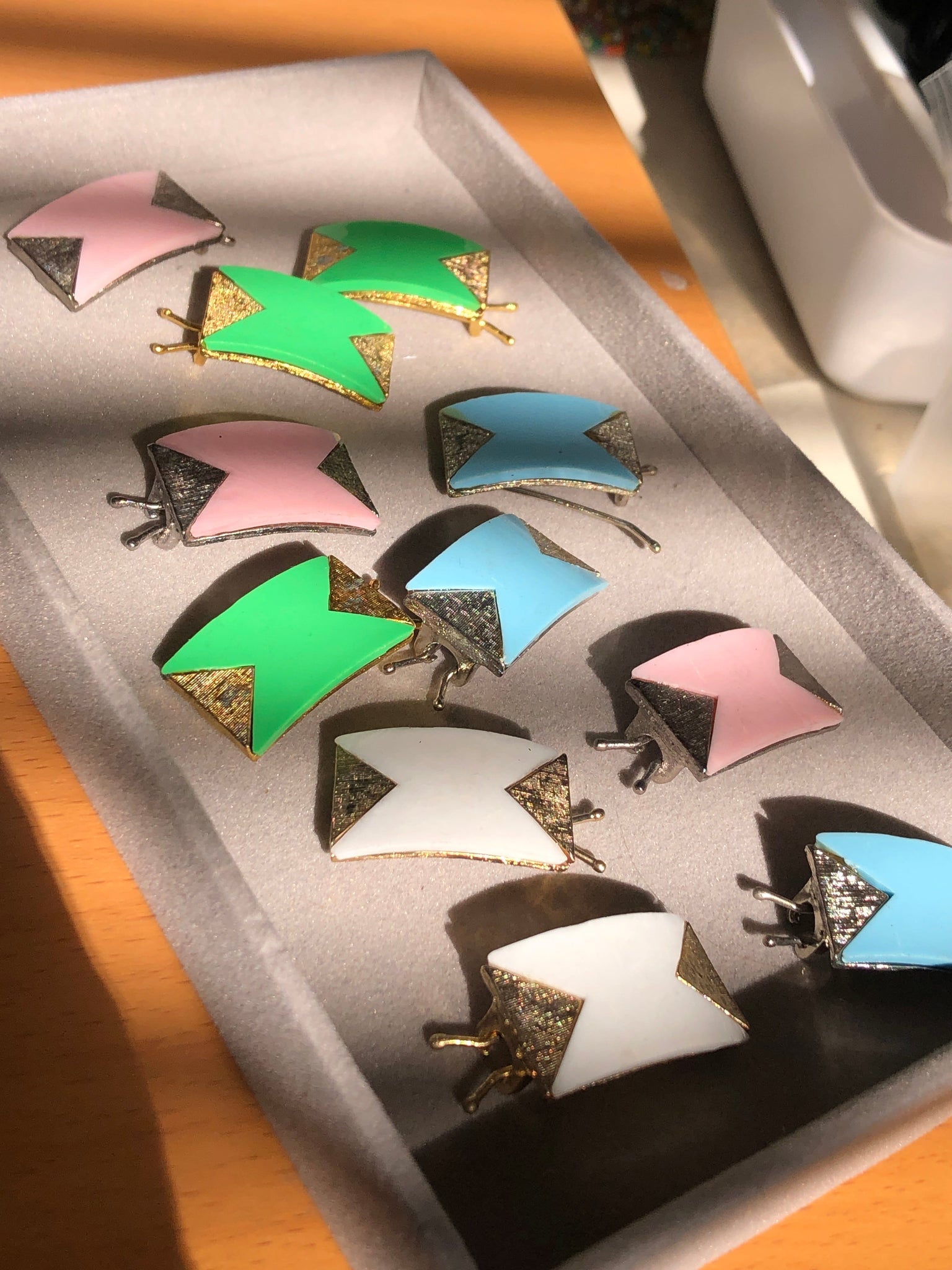 Jewelry made with vintage lucite parts that were made in Rhode Island in the 1960's - early 80's by Best Plastics. We hand-set them with surgical steel earring posts and they have sturdy surgical steel/acrylic backings on them as well. Light-weight & fun to wear.
