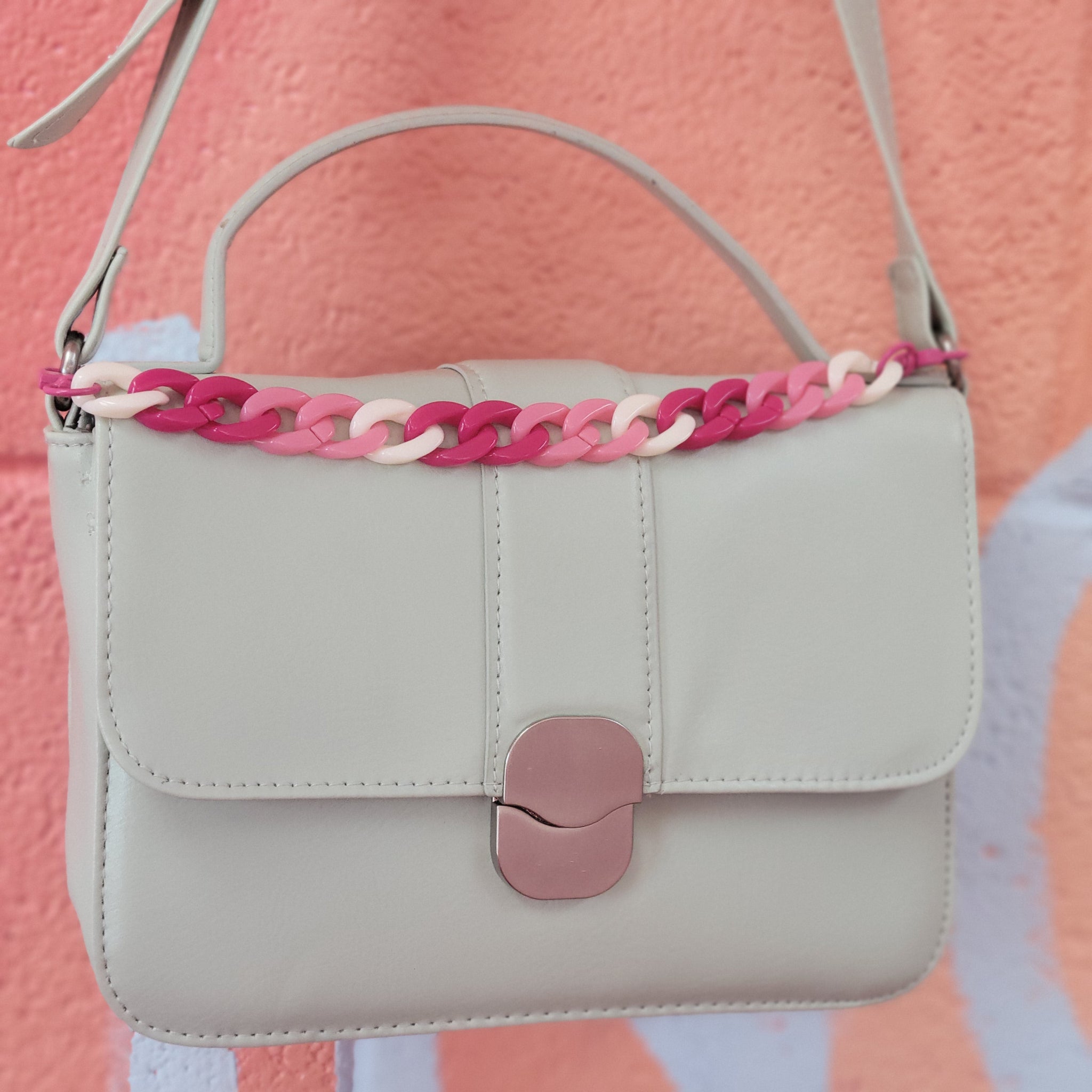 This chain blends soft pink, hot pink, and creamy white for a look that’s sweet without being shy. It's a candy-colored accessory that adds instant charm to any bag.