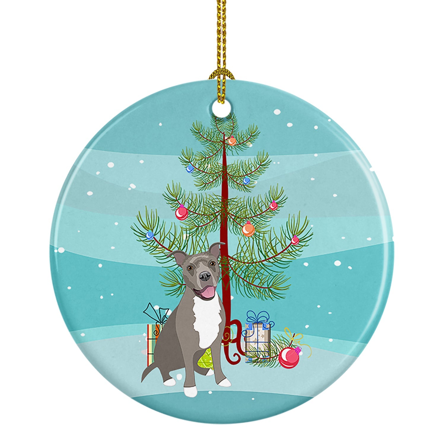 Ceramic Ornament featuring breed specific Pit Bull Terrier artwork. Celebrate Christmas with this Christmas Ornament. Add a touch of personalized charm to your Christmas tree this holiday season with our Ceramic Ornament. Measuring 2.8125 inches in diameter, this round porcelain ornament beautifully reflects your festive lights, enhancing your holiday decor. The gloss surface sets off the vibrant, full-color artwork contributed by one of our talented artists, bringing a pop of color and joy to your tree. This Ceramic Ornament doesn't stop at being merely decorative. The white back is designed for personalization. Write a heartfelt message, mark a special year, or inscribe a date with a paint pen or a permanent marker to create a treasured memento. Please ensure you allow any personalization to dry thoroughly before handling to maintain the pristine finish. Included with the ornament is a delicate gold cord for easy hanging. Made in the USA, this Ceramic Ornament makes an exceptional gift for a pet sitter, teacher, family member, or anyone you wish to share a little Christmas magic with. With its blend of style, charm, and personal touch, it's a meaningful addition to any Christmas tree.