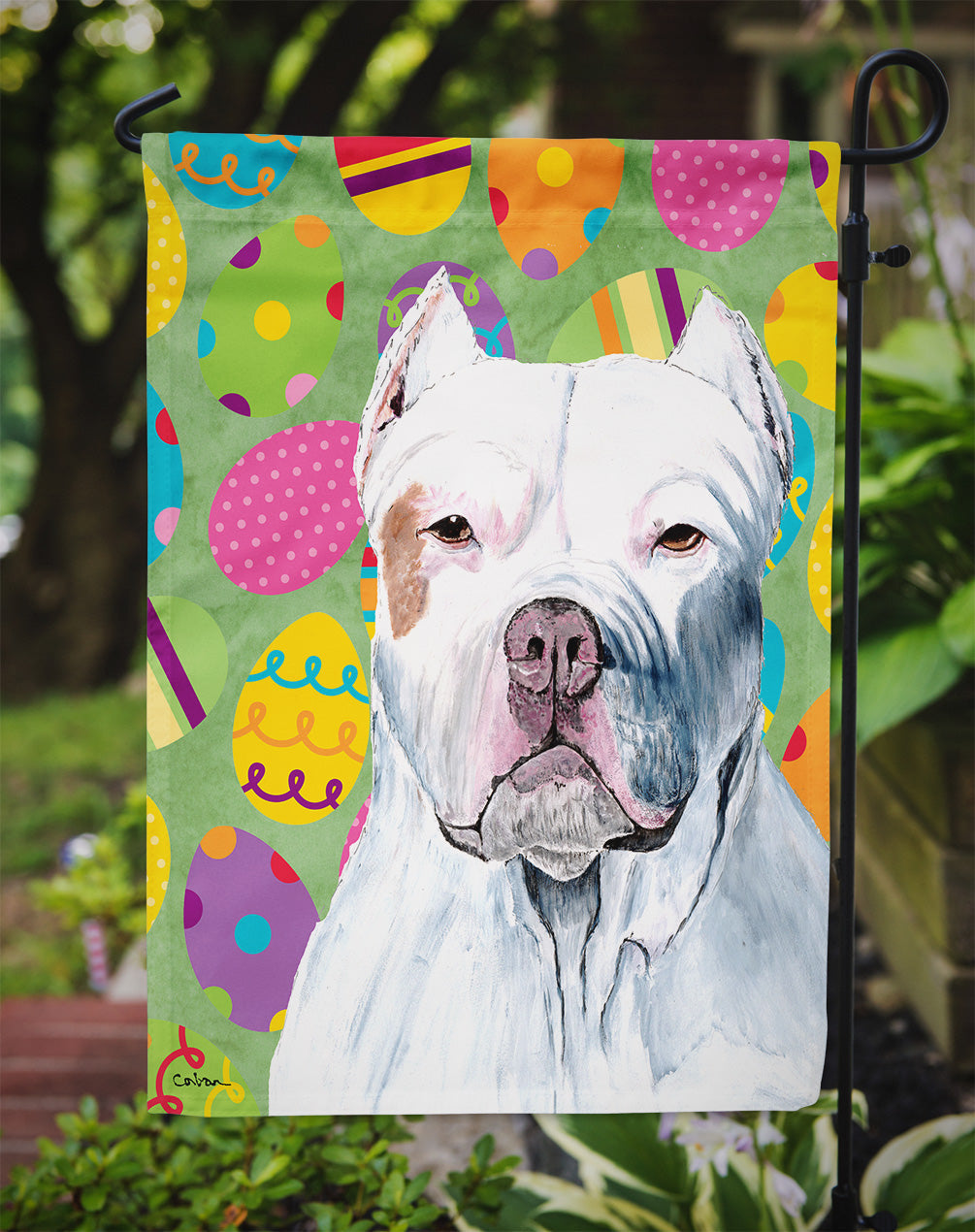 Decorate your space with our Easter Pit Bull Terrier artwork on a Garden Flag. Enhance the beauty of your garden, patio, or yard with Caroline's Treasures Decorative Garden Flag, proudly made in the USA. Crafted from two pieces of thick, double-sided polyester fabric, this 2-ply garden flag is designed to withstand various weather conditions, making it water-resistant and weatherproof. Featuring correctly readable words on both sides, this garden flag offers a delightful visual experience from any angle. With its heavier weight, it stands out among other garden flags, ensuring stability and durability even in wind, rain, and snow. Measuring approximately 11 1/4 inches by 15 1/2 inches, this flag allows you to personalize your outdoor decor. It comes with a 1 1/2-inch sleeve sewn in, allowing easy attachment to any standard garden flag stand or garden size porch hanger (sold separately). Make a statement in your outdoor space with Caroline's Treasures Decorative Garden Flag, a vibrant and high-quality flag that adds color and personality to your surroundings. Proudly made in the USA, it's a symbol of quality craftsmanship and attention to detail.