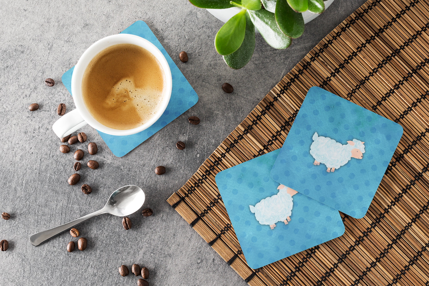 Decorate your space with our Sheep artwork on a Coaster set. Presenting our Set of 4 Foam Coasters, a stylish and practical addition to your table setting. Each square coaster, measuring 3 1/2 inches by 3 1/2 inches, is perfectly sized to accommodate various drinkware, from coffee mugs to tumblers. These coasters stand out with their full-color artwork, permanently dyed onto the material for a vibrant and fade-resistant finish. They're not just functional, they're a fashionable statement, adding a touch of flair to any gathering or event. Our foam coasters serve a dual purpose - they protect your table from water stains and are perfect for both hot and cold drinks. The material used is similar to that of our high-quality mouse pads, ensuring durability and heat resistance. These coasters are easy to maintain - simply wash them in the top of your dishwasher and lay flat to dry. The design won't come off, ensuring they retain their vivid colors for years. Pair them with one of our insulated coolers or huggers for a cohesive, thoughtful gift set. Enhance your beverage experience with our Set of 4 Foam Coasters.